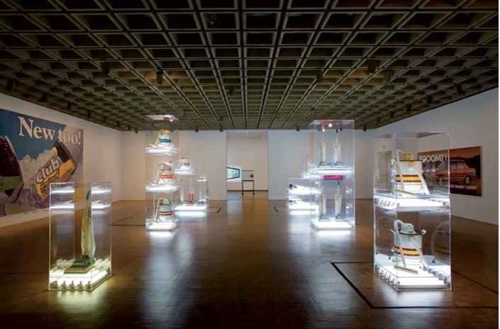 接下来的展览-备受期待的杰夫·昆斯回顾展并没有出现这样的疑问。这场展览相当于一次标志性的声明:惠特尼作为首屈一指的美国艺术博物馆,必须要为这位最负盛名的美国艺术家作出明确诠释。开启这次展览之旅,视线所及,不禁令人想起阿尔贝蒂的透视法。堂皇的走廊两侧,堆满了有机玻璃盒子,这些物品照亮了四周,过道两侧通过中间的一个开口汇合在一个消失的点上,在这里,一个篮球悬挂在装满液体的槽中央。