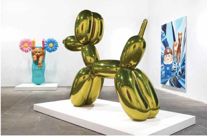 从罗斯科普夫对展览的组织层面而言,其中蕴含的执导力,再想到作为三幕传记片式的楼层,那么,放置早期作品的房间在此就好比创作中的玫瑰花蕾,纵然是《公民凯恩》,也超越了好莱坞的戏码。随着作品的一个个展开,每一个系列被赋予了应有的尊严,以自己的特性存在着。在那个窄小的闪回过去的展厅里,几乎没有什么看起来是不能被预想的了。就如任何不凡的人生事迹一样,接下来就是成功的巅峰:在这里,出现的就是一角商店小装饰物的庞大的模仿品,即1988年的“平庸”(Banality)系列。(沿着中间楼层的走廊按照军衔排开,这些高度暴露的雕塑再次光鲜如昨:为什么泡泡没有下半身?那只嘉年华上的大熊想对被催眠的伦敦警察叔叔干什么坏事?)