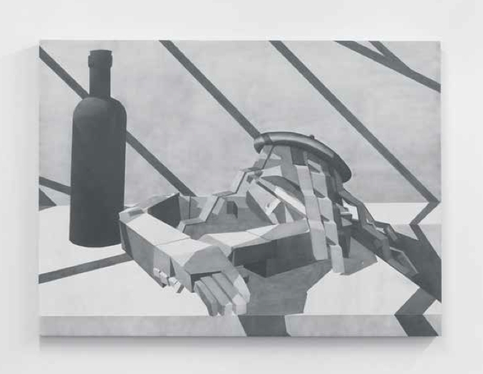 艺术家的非正常、波希米亚生活在辛格作品里以不同方式反复出现。例如,在《星期六晚上》(Saturday Night, 2013)中,一个立体主义风格的人像瘫在吧台上,正处在名副其实的解体过程中,旁边是一个写实风格的酒瓶。但她的画处理的既不是创造性中变形状态无处不在这一主题,也不是像基朋伯格几张自画像里那样直接表现喝醉的艺术家,辛格的作品把酗酒的艺术家表现为了一个幻象,还在他/她已经让人分辨不出形状的头上盖了一顶贝雷帽。根据雅克・拉康的说法,识别幻象的标志是它实际上冲在“真实”的前面,保护后者,从而让后者变得更难获取。因此,幻象与真实紧密相连,但同时又掩盖真实。我们可以说,辛格绘画中艺术家的生活处境被展现得一览无余,但另一方面又因其幻象特质维持了一种遥不可及,让任何资本主义的回收尝试变得更加困难。