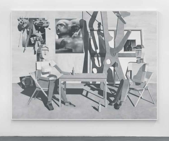 去掉了前卫艺术的开放性,辛格的作品转而调动了我们对如今艺术家生活的种种幻想。因此,2013年她在柏林Kraupa-Tuskany Zeidler画廊的首场个展就叫做“艺术家们”,俨然一场真人秀或肥皂剧,而且和电视系列剧一样,展出的绘画作品也塑造并展示了这些“艺术家们”如何生活和工作的景象。比如,在《工作室访问》(The Studio Visit)中,我们看到两个看上去仿佛是木块雕出来的机器人形象——女性艺术家(长头发,但脸上只有鼻子和眉毛)和头戴棒球帽的男性访客——坐在桌边,背后的工作室墙上挂着典型的“现代艺术。”其中一张具象画令人联想起毕加索“秩序回归”期的作品,它的左边是一幅挂满齿轮和暗钉的机械画,右边是一张绷好并反过来挂在墙上的画布,画布前矗立着一座类人形的现代主义雕塑。艺术家手里拿着酒瓶:一个过度的、波希米亚生活方式的象征符号,该符号至少从亨利·缪尔热(Henry Murger)1851年的小说《波希米亚人的生活情景》问世以来就一直跟艺术家的生活联系在一起。辛格的绘画同时捕捉到了我们对当代艺术家的陈腐投射,以及该投射所扎根的“工作室访问”这一常常令人尴尬的经济和社会现实。
