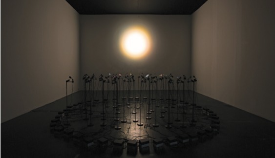 另一件作品《+》(2016)也呈现了艺术家与光有关的实践。在这件作品中,尚一心将约四十只光源呈白色、黄色和粉色的手电筒放在支架上,并将支架在地面上排成圆形。每只手电筒的光源处都装有以固定节奏开闭的金属快门。当快门开启的时候,三种颜色的手电筒光线在展厅一侧的墙上汇成一个暖色的光晕;而随着快门闭合,光晕又四散为投射在快门上的光点。在上述两件装置作品中,艺术家都使用了数量较多的与支架一体的机器。它们在作品中排列整齐,且在运转时发出轻微的声响。这些机器不仅制造了作品,也成为了作品的一部分。借此,艺术家并置了幻象和幻象的制造过程。