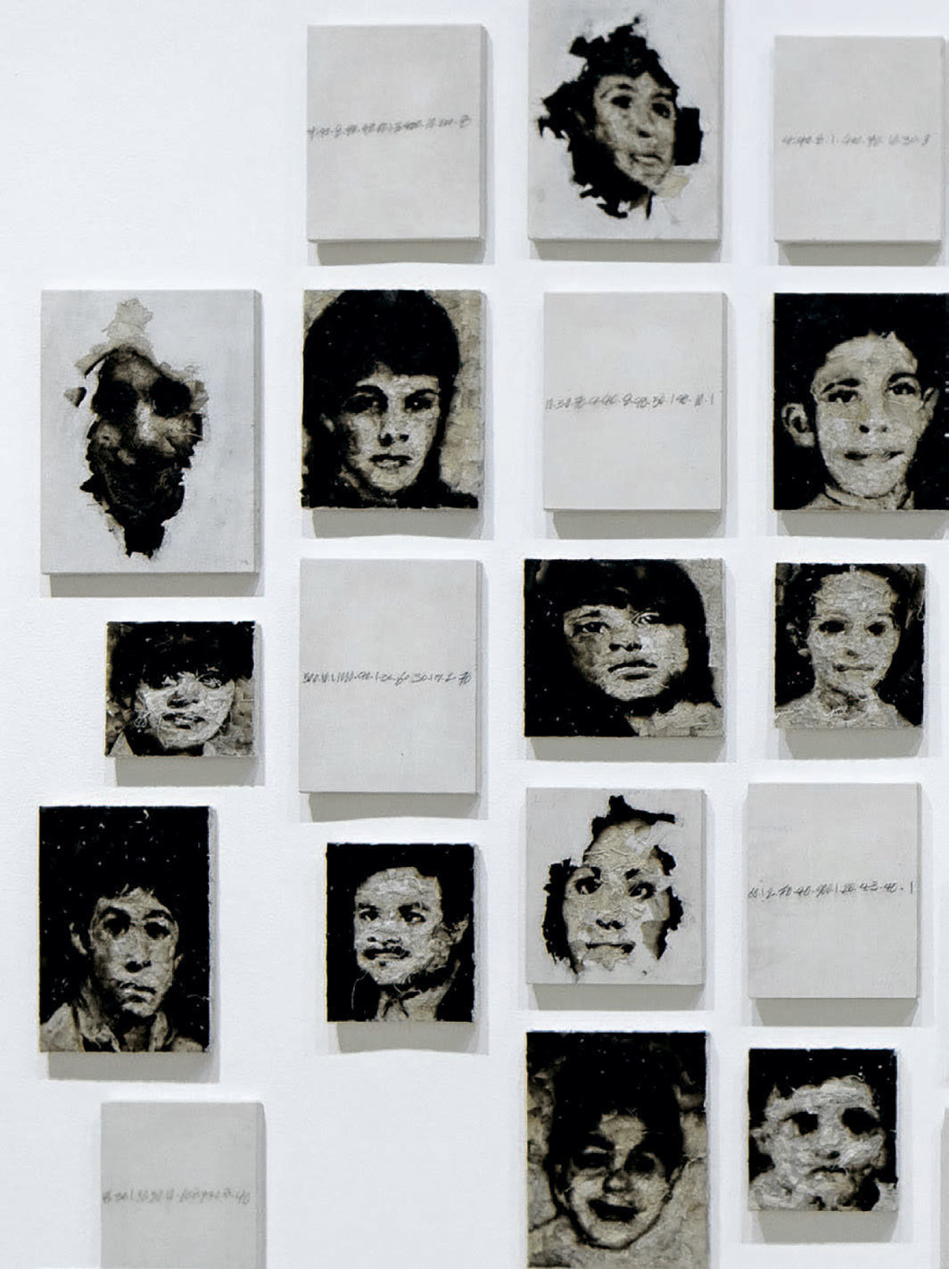 “行动剧场:海湾战争1991-2011”眼下正在纽约MoMA PS1展出,这个展览包含一系列实物课程(object lesson),来思考这些“历史的演员”带来的长期影响。展览由皮特·艾里(Peter Eleey)、鲁巴·卡特里布(Ruba Katrib)、乔斯琳·米勒(Jocelyn Miller)、约瑟芬·格拉夫(Josephine Graf)和奥利弗·舒尔兹(Oliver Shultz)联合策划,占据了美术馆全部三层空间,依循时间顺序展示了在海湾战争和伊拉克战争期间创作或者回应战争的作品,其中既包括西方艺术家的作品,也包括伊拉克本土以及离散艺术家的创作。几位战争策动者的面孔贯穿了整个展览:从罗杰·布朗(Roger Brown)的《海湾战争》(Gulf War, 1991)里被直升机和坦克包围的老布什和萨达姆的漫画肖像,到吕克·图伊曼斯(Luc Tuymans)2005年创作的更为古怪的油画——画面中的脸属于前国务卿康多莉扎·赖斯。与面孔遭遇的沉重感在哈娜·马拉拉(Hanaa Malallah)的《她/他没有照片》(She/He Has No Picture,2019)里得到了高强度的体现,这是一个由肖像构成的装置——艺术家根据1991年海湾战争期间被轰炸的阿米里耶(Amiriyah)难民营受难者的照片创作的肖像绘画。如果马拉拉无法找到某个人的照片,她就在空白的画布上写下此人的名字(并被译成数字密码)。在这些面孔构成的网格里还夹杂着一些铜牌。上面刻有阿拉伯语的作品标题——这个短语用来指称那些难民营中被推认死亡的人——精确而自觉地反映出这个时常被描绘为完全由图像构成的战争在集体心理上刻下的印记。