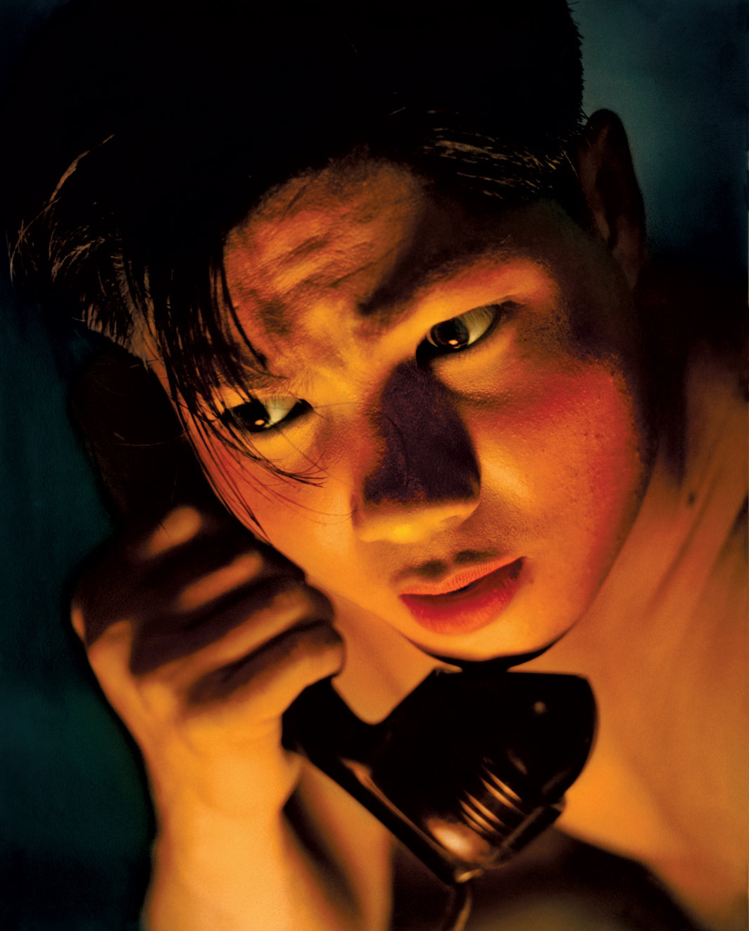 摄影作品也许永远会受到尺寸调整的左右,但《忐忑》(Apprehension)是那种无论在哪看到都能够保持同样强度的图像之一。画面中央是一个放大的年轻亚洲男性的脸,他像握住一根短棍一样握住电话听筒,额头上有深深的抬头纹,一绺头发垂在眼前。两根延伸到眼角的凌乱发丝看起来像是裂痕,仿佛预示着某种即将发生的解体或破裂。被来自画面下方的不明光源照亮的脸庞呈现出强烈的光影效果。他的肌肤是充满戏剧感的玫瑰色和金色,让人想起二十世纪中期艳丽色情的通俗插画,或是与世俗戏剧融合的巴洛克宗教绘画。“过熟”,我想到了这个词。有什么东西即将坠落。