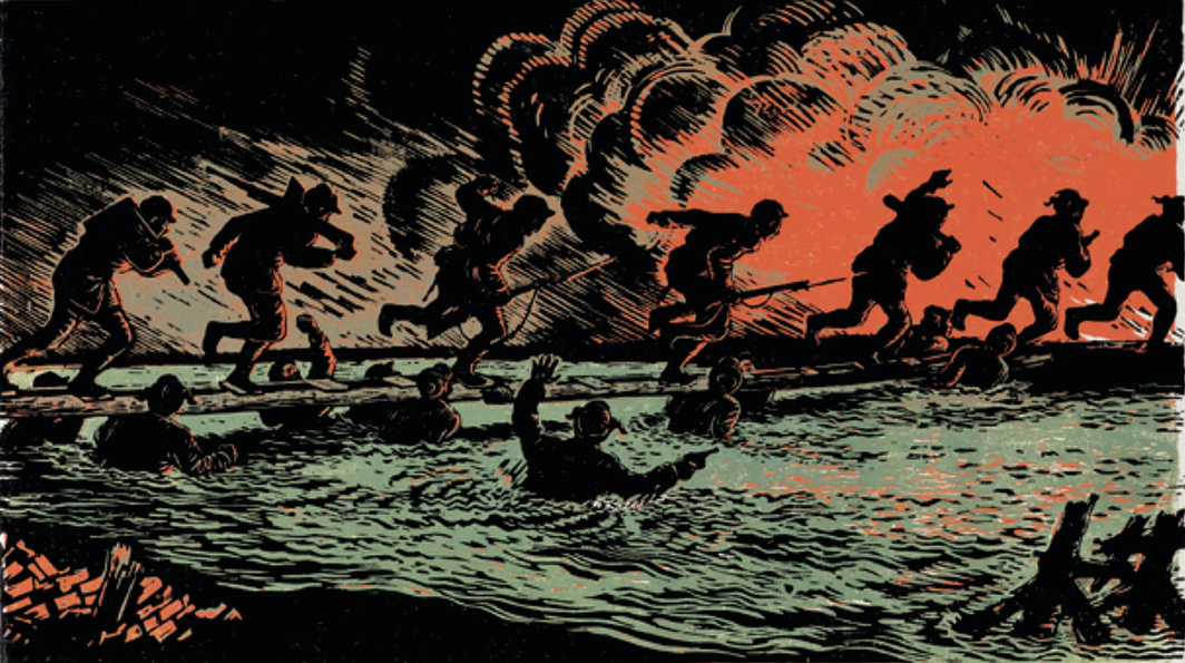早在1970年代关于彩色摄影的艺术地位的争辩达到顶峰之前,杨超尘就已经开始尝试用色彩将照片中的光线与绘画及其他艺术媒介中对光线的处理方法联系起来。(原本的底片是黑白的,杨超尘用当时新的Flexichrome工艺对照片做了手工上色。)我们在《忐忑》中看到的饱和光芒可能只是来自一个电灯泡,但画面中的颜色让它看似来自实际意义以及比喻意义上的爆炸物。我不禁想起了古元《人桥》(1948)右半部分仿若珊瑚的爆炸场景,这幅广为人知的木刻作品描绘了解放战争中军队从浮桥上渡江的场景。 虽然在世界的另一端的杨超尘并没有参加从1927年持续至1949年的国共内战,但他或许同样见证了足够多的战斗,以至于他能够让橙色看起来不再是简单的橙色。强烈的光线将杨超尘模特的肉体变成黑暗和明亮相交的斑块,宛如古元画中火光映照下地狱死亡图景的镜像。我这样说也许有些僭越,但上述共鸣已经强到足以让人发问,亚洲的身体是否只有在紧急状况下才会被看见:令人目眩的闪光灯、残酷的炼狱、炸弹下的地狱之火,甚至是审讯室的头顶强光。