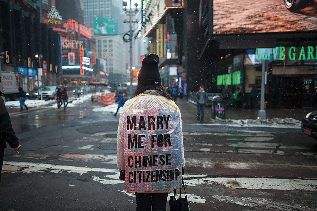 第一件让李爽获得关注的作品是她从纽约大学媒体研究系毕业后不久进行的一项行为,名为《和我结婚,拿中国国籍》(Marry Me for Chinese Citizenship)。在2015年情人节那天,她挂着一块写着作品标题的牌子,在纽约时代广场上闲逛了六个小时,这句诙谐讽刺的挑衅话语引来不少路人友好的微笑。让李爽印象深刻的是,有几个人误认为这是一位中国移民对美国绿卡的真心恳求。“他们会突然走过来跟我说,‘给我一万美元,我就娶你’。”