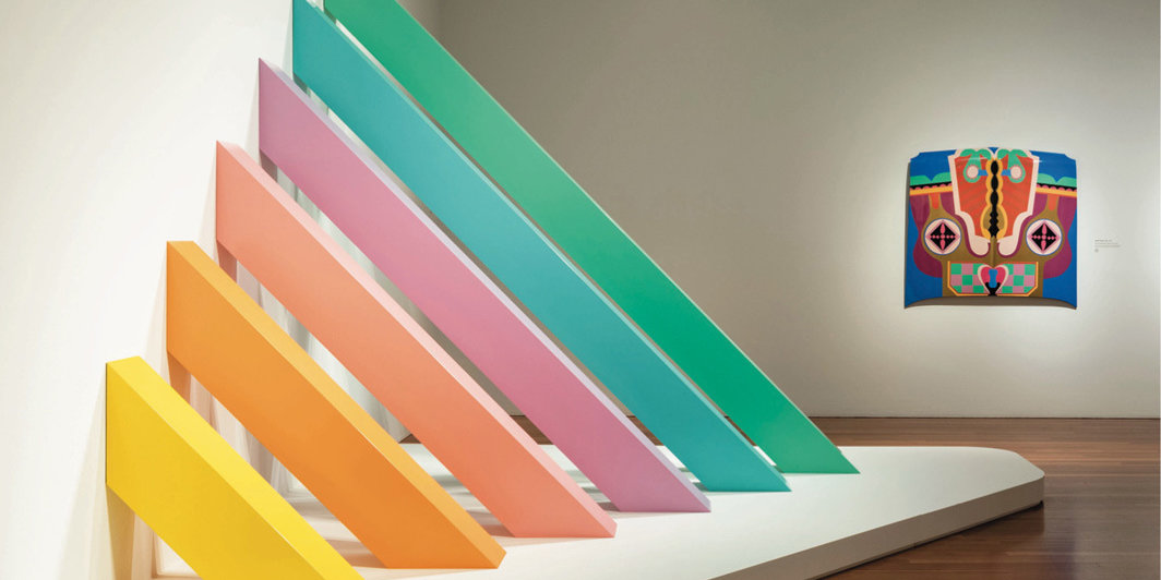 “朱迪·芝加哥:回顾展”展览现场,2021. 从左至右:《彩虹木桩》(Rainbow Pickett), 1965/2021;《生育罩》(Birth Hood),1965/2011. 摄影:Drew Altizer.