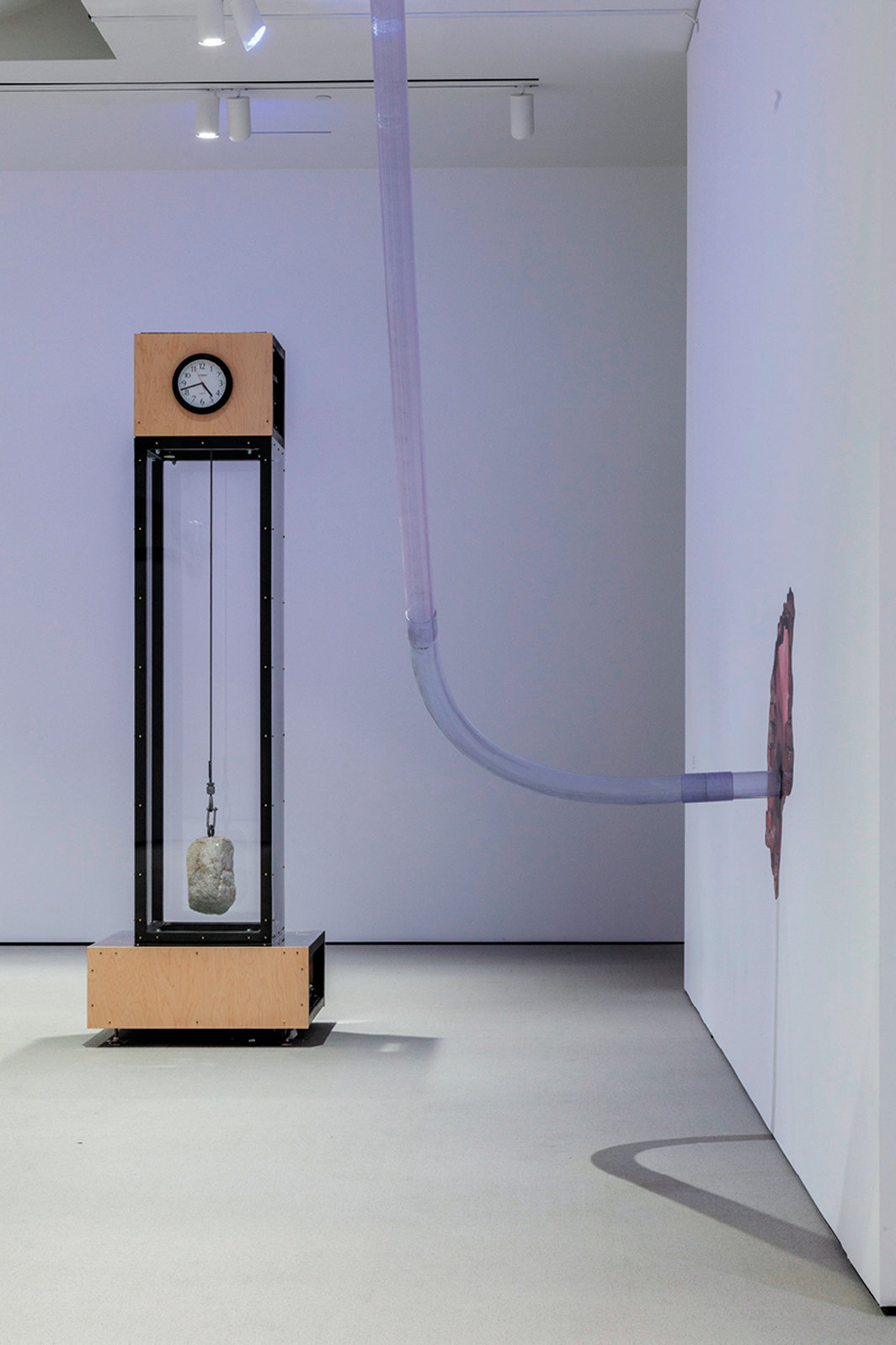 尽管统一感笼罩着整个空间,但还是有部分作品跳脱出来:最大的一件是莫拉格·凯尔(Morag Keil)的《呕吐物旋涡》(The Vomit Vortex),这个空气传送管道系统蜿蜒地穿梭于不同展厅之间,过一阵子就发射一弹艺术家的人造呕吐物出来绕展览转一圈。这是一件有点傻、有点中二的作品,但我这样说完全是褒义——装傻可能是现在保持严肃的唯一方法了。巨大的透明管道在角落处穿透墙壁,暗示美术馆经过调控的表面背后还藏着一套基础设施。每个墙壁开口处的周围都贴着一张很大的贴纸,上面印有美术馆的“内部景象”,有的形同伤口,有的显示的是老式砖墙,还有一些是附近设施(比如美术馆咖啡店)的照片。颇具启示性的是,对内部的揭示也是假象。这件作品让人想起罗伯特·史密斯森(Robert Smithson)1972年呼吁对“将艺术家缝进去的装置”进行调查的说法,但五十年后的今天,“缝”已经不足以描述两者关系了。更准确的说法也许是被加工和被粉碎?被嚼烂,被消化,再被吐出来?面对复杂的艺术界,艺术家已经无力再灵巧穿行于其间了。她变成了一件加工产品,一种剩余物,从系统这头进去,再从那头出来。