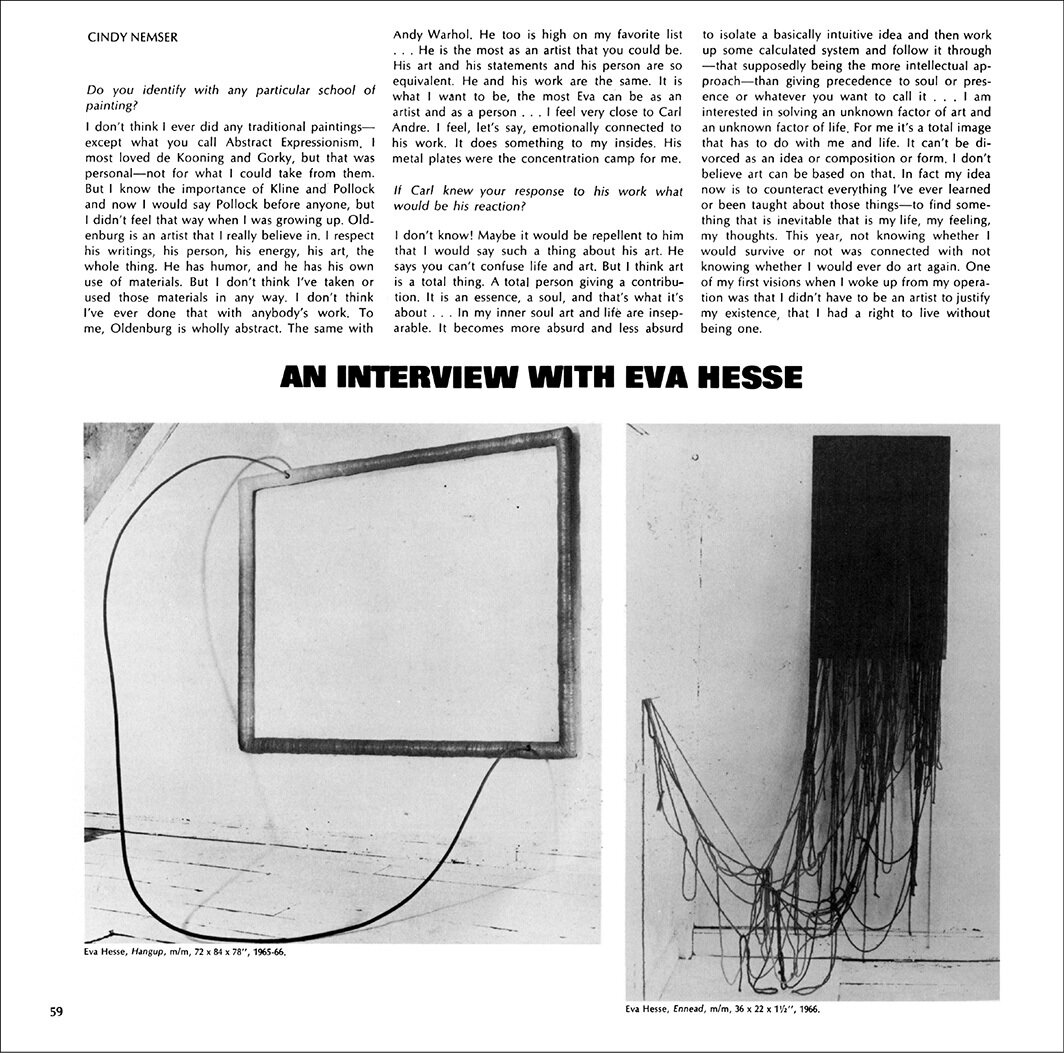 和史密斯的采访一样,海瑟的对话也经过了大量编辑,九十页的听打稿被砍成五页长的文章。同样,文中充满了快速的转折和突兀的并置,这在第一轮问答就已经非常明显。当被采访人辛迪·内姆瑟(Cindy Nemser)问到她有没有对“哪个具体的绘画流派”感到亲近时,海瑟举出了波洛克、奥登伯格的名字,尤其还有沃霍尔,后者得到了她最全面的认同:“他是一个艺术家能做到的极致。他的艺术和他的声明,还有他这个人都达到了高度一致。”[6]接着,她丢出了这么一段爆炸性发言: