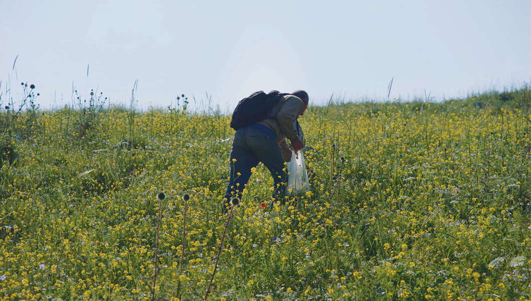 如果我们从语源学的角度来追溯“forager”这个词,可以发现它在演变过程中产生了截然不同的含义。15世纪英语里用该词来描述四处寻觅食物的人;一个世纪后,古法语中的“foragier”则指的是掠夺者。朱玛娜·曼纳(Jumana Manna)最新的电影作品《觅食者/掠食者》(Foragers,2022)就利用了这种语义上的跳跃,这件作品也是这位居住在柏林的巴勒斯坦艺术家近期在纽约MoMA PS1的中期大型展览“打破,拿走,抹除,标记”(Break, Take, Erase, Tally,策展人为鲁巴·卡特里[Ruba Katrib])的核心。电影长约一小时,曼纳的镜头跟随着在田野里四处漫游采集植物的阿拉伯人,他们在寻找他们最喜爱的香料——主要是za’atar和aakoub——并且给予了这个活动中蕴含的感官之美、人与环境的纠缠互动以及这项在黎凡特地区持续了数个世代的传统的传播以充分关注。曼纳也将一种批判性的眼光投向了以色列的法律系统,以色列法律把采集野生植物规定为犯罪行为。1977年,以色列政府禁止了采摘za’atar;2005年,采摘aakoub也被定为非法活动。这些都是阿拉伯烹饪中的基本材料,几个世纪以来作为食物和药物被食用。《觅食者/掠食者》呈现了这个词的双重历史,将饮食的柔和形态与殖民剥夺的暴力之举并置。