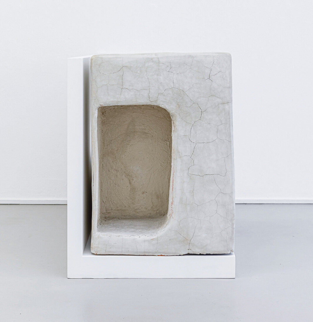 在她的雕塑实践中,曼纳既从过去的居住模式也从当下的生存条件中汲取灵感。2014年在纽约雕塑中心举办的展览“起源的威胁”(Menace of Origins)里,她展示了建筑碎片——楼梯、地基板、基座——这些碎片似乎是在考古挖掘过程中出土的,但同时也提示了以色列在传统巴勒斯坦人定居点挖掘文物的事实。2018年的“缓存系列”(Cache Series)源于她对Riwaq建筑保护中心的研究,该中心位于拉马拉,致力于保护建筑遗产。在2015年与Riwaq一起开展的研究之旅中,她参观了约旦河西岸的废弃房屋,在那里她拍摄了“khabyas”,一种种子储存单元。这些在整个黎凡特农村地区随处可见、巧妙但被常忽视的小房间可谓今天种子库的古老前身,曼纳开始将它们的块状形式转化为令人屏息的雕塑。