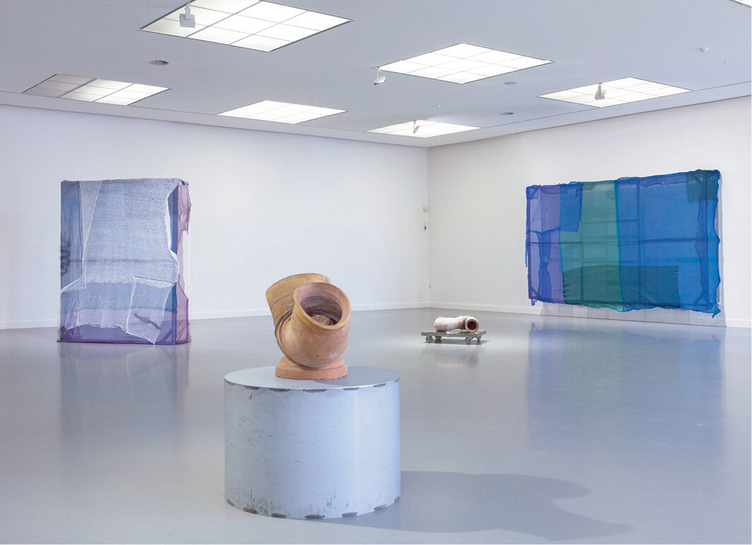 “水臂系列”也暗示了情色意义上的“插入”,那些接口紧紧地包覆住彼此。实际上曼纳的很多陶瓷雕塑——连同它们的四肢、器官和关节区域——都表现出她对粘土的某种身体属性的敏锐认识。她2021年在安特卫普当代艺术博物馆(van Hedendaagse Kunst Antwerpen)举办的展览“肚子里的三十个管道工”(Thirty Plumbers in the Belly)将人类消化系统与处理和承载这一过程的市政污水系统联系起来。起皱的管子蜿蜒下垂,开口处大大地张开。不远处,有着法兰式接头的断开的管道在地板上蹒跚而行。用来分隔空间的是覆盖了脚手架防尘布的木质骨架,带来一种低限度使用材料的即兴和灵活。通常隐藏在公众视线之外的市政基础设施有赖于持续的维护和有力的责任制度,但曼纳暴露在外的装置可视化了对其恶意的忽视。
