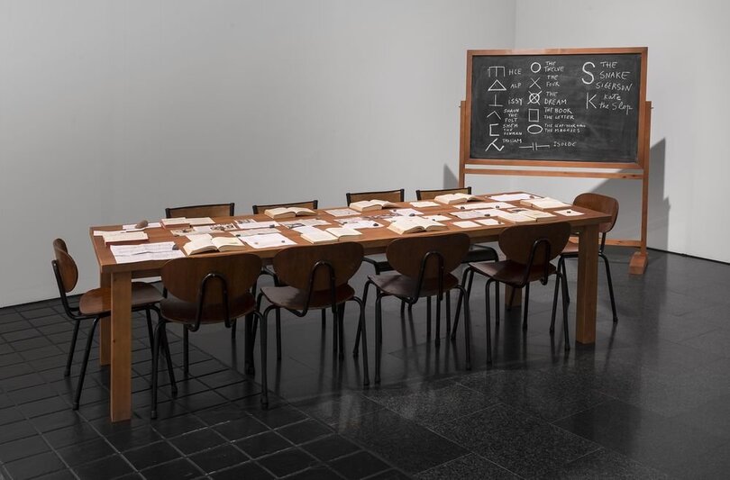 如果这听起来很熟悉,那么你已经看过研究型艺术(research-based art)了。虽然具体的元素各异,但这种艺术形式的特点是依赖文字和话语来支持大量的研究材料,并在空间内分散展示。水平陈列(展示柜、桌子)比垂直陈列更常见,整体结构是做加法而非浓缩,遵循的是越多越好的逻辑。每当我遇到这样的作品,我就感到一阵轻微的恐慌:要花多长时间才能看完这一切?