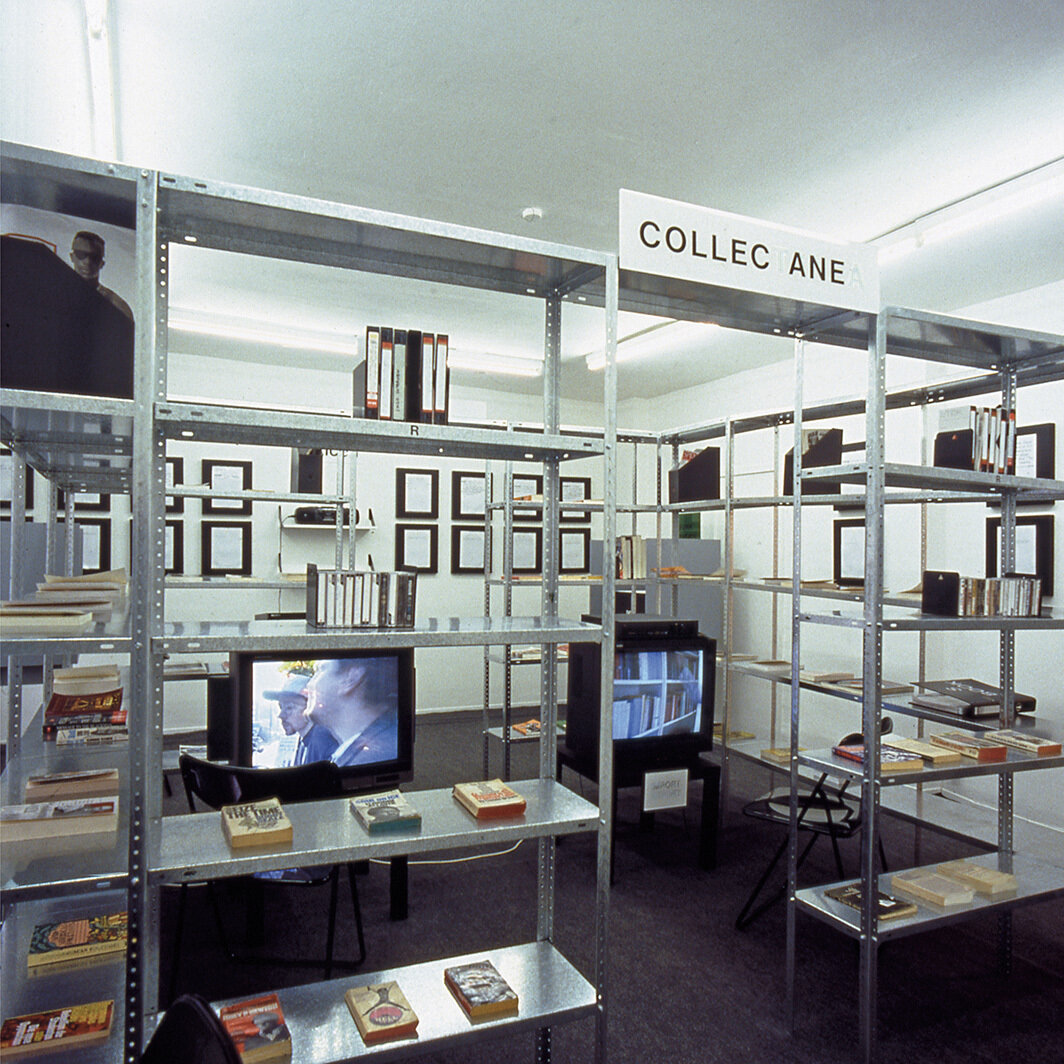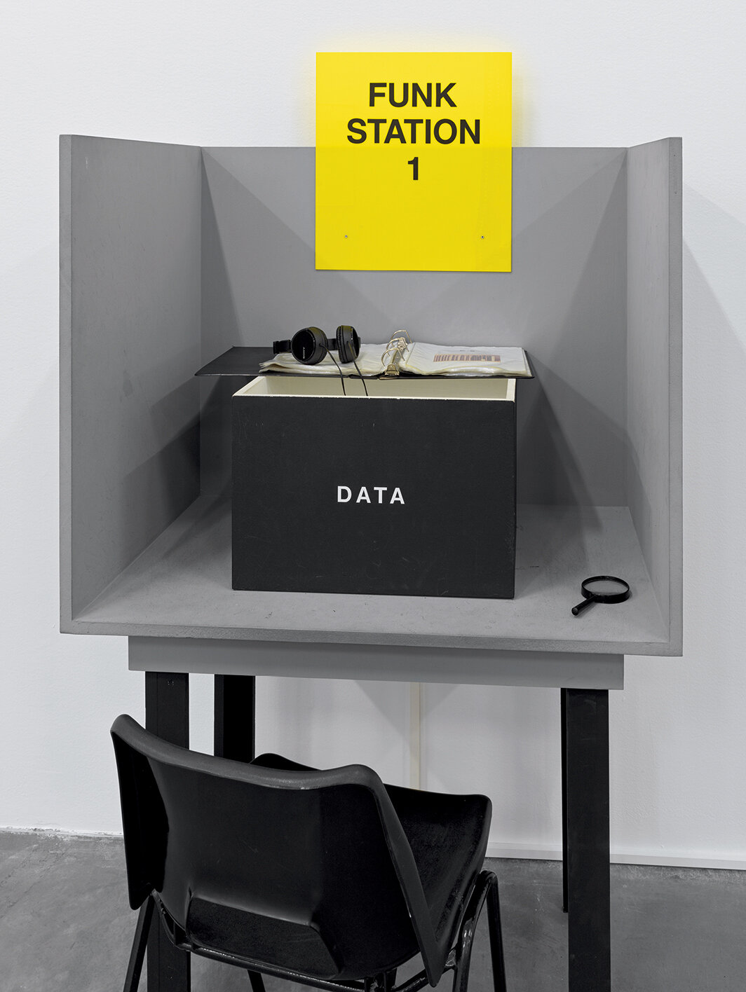 蕾妮·格林(Renée Green)的装置《进口/出口放克办公室》(Import/Export Funk Off,1992-93)是研究型艺术1990年代初作为一种新的混合类别出现时的典型代表。[6] 主题上,它探讨了非洲离散文化、波西米亚和亚文化。形式上,这件作品由金属层架组成,上面摆满了从德国评论家迪德里希·迪德里希森(Diedrich Diederichsen)那里借来的书、杂志和照片,他为这个项目接受了长时间的采访。格林的影像记录总时长超过26小时,观众可以观看这些资料,或是查阅其他录音和阅读材料。《进口/出口》打破了先前的艺术研究模式,因为它邀请观众成为作品的用户,他们可以随意探索并组合作品提供的信息碎片,甚至将这些资料用于自己的研究(或者至少扮演这个角色——注意一个标有“数据”的箱子顶部放着一双白手套)。1995年,格林推出了作品的CD-ROM版本,她认为与展览空间相比,通过数字超链接可以更方便地使用这些研究资料,因为观众在展厅里总是时间不够。