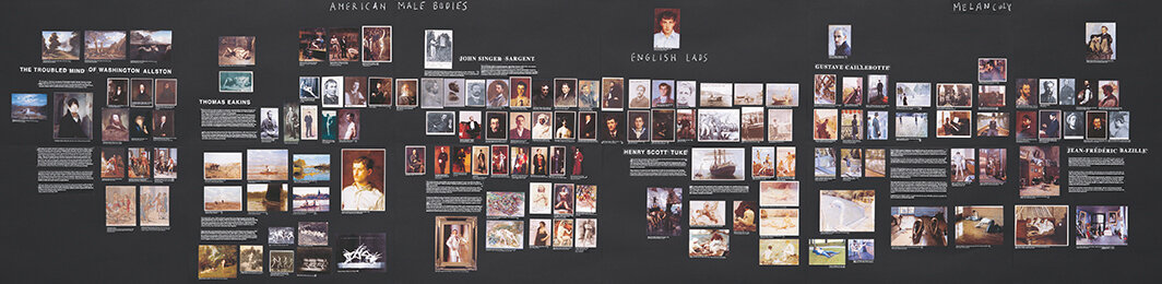 很少有艺术家将自创的阐释框架加诸于这类聚合作品上。丹麦艺术家亨里克·奥尔森(Henrik Olesen)的《一些出生于约1300年至1870年间的同性恋艺术家和/或与同性恋社会文化有关的艺术家 》(Some Gay-Lesbian Artists and/or Artists Relevant to Homo-Social Culture Born between c. 1300–1870, 2007)是其中一个令人耳目一新的例子。奥尔森明目张胆地用他无视时空顺序的酷儿视角来(误)读艺术史,将绘画和印刷品的数字副本以及现存学术研究的片段按不同主题归类,如“女同性恋的可见性”,“一些娘娘腔手势”,“英国的肛交”等等。通过这些资料的积累和并置,奥尔森以调侃的方式重新梳理艺术史,比如古斯塔夫·卡耶波特(Gustave Caillebotte)的户外男性写生现在被狡黠地归类为“寻欢”。
