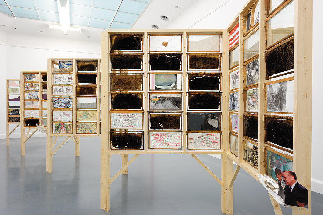 博格伊根的研究包括线上和线下,但更重要的是,她的研究是具身性和持续性的:她所有的文学、历史和哲学阅读都基于她本人在这些事件发生地的经历。她的所有绘画都是在现场或根据自己拍摄的照片创作的。不同的事件在肖像素描、颤抖的线条、爆发的文字和色块中被视觉化。观众的接受方式同样也是身体性的。《盐商》展现了艺术家的研究成果,但将其融合成一个具有丰富感官性和争议性的综述,在视觉上呈现出雕塑感,并提供嗅觉体验。图像和文字交织在网格中,但其中也时不时穿插着空白画框,里面填满了沙子、盐和蜂巢等有机材料,这些沉默和不透明的瞬间为观众提供了停顿、呼吸和思考的机会。