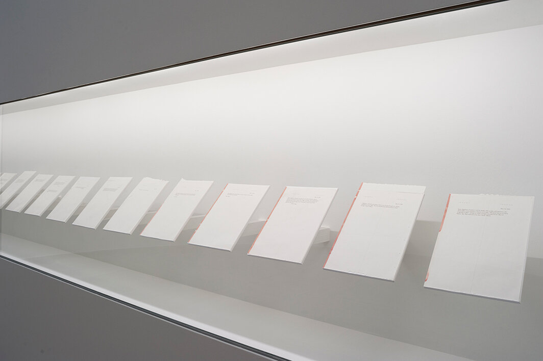明信片、传真和电子邮件的打印件苍白地躺在玻璃展示柜里。胶合板架子上放着一排排展册。一面展墙上贴着各种图表,另一面挂满了看似相同的照片。一组显示屏上,说话的人正在解释些什么。一个黑暗的角落里,幻灯片投影仪缓慢地切换轮盘中的图像。附近,一台16毫米电影放映机伴随着催眠的旁白呼呼作响。一张被照亮的桌子上摆满了标有便利贴的文件和剪报。每件展品都附有艺术家写的长篇解释文字,这些文字也印刷成册。
