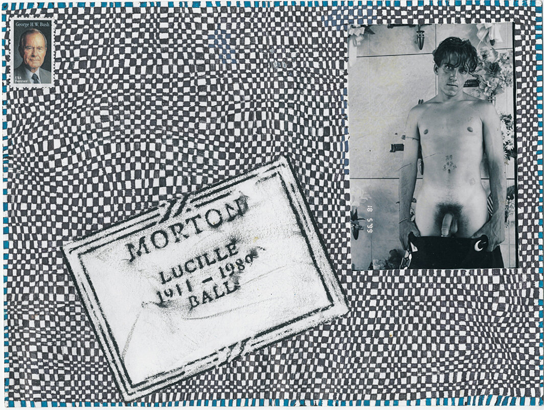 在其中一幅里,露西尔·鲍尔(Lucille Ball)的名牌——拓自这位喜剧女演员在洛杉矶森林草坪纪念公园骨灰安置所的灵龛——黑乎乎、脏兮兮地印在纸上,旁边是一张照片,照片上,一名性器粗壮的裸体男子现身于一个堆满杂物的房间……艺术家的工作室?下一幅里,鲍尔的名牌被口红一样黏腻的红颜料直接印在了另一张照片上,照片中,一根勃起的阴茎挺立在某位迈克尔·S·萨鲁波(Michael S. Salupo)的坟墓前,看起来这位墓主人逝于1987年。还有一幅里,名牌的拓片呈四十五度角向上倾斜,指向画面右上方裸体男性的照片。男子赤裸的上半身上能看到疤痕和纹身,他褪下裤子,露出生殖器,双眼直勾勾地望向镜头,让观众不敢轻易挪开视线。画面左上角贴着一张印有美国前总统老布什(George H. W. Bush)肖像的邮票,他蝰蛇般薄薄的嘴唇微微翘起,展现出某种诡异的、自我满足的笑容。这件作品让人联想到明信片,也许发送自地狱某些更性感,更欢乐的区域。老布什邮票的底部印着“美国永生”(USA FOREVER)几个字。结合考佛特创作的整体语境,该短语带上了一种颇具喜剧色彩的丧葬风味——仿佛应该把它用鲜花拼出来种在美国的坟头上。