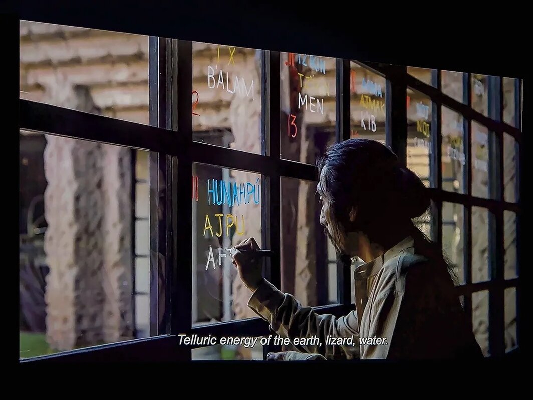殖民掠夺的历史、文化遗产的流失和随后的复活,构成了克拉丽莎·托辛(Clarissa Tossin)在《在火山歌唱之前》(Before the Volcanoes Sing, 2022)中所探讨的主题。影片主要在弗兰克·劳埃德·赖特(Frank Lloyd Wright)于1926年打造的“约翰·索登之家”(John Sowden House)拍摄,这座宅邸是以1920、30年代的玛雅复兴风格设计,但却与洛杉矶周边蓬勃发展的丰富多样的玛雅文化全然脱节。在一面玻璃墙上,伊克西尔玛雅(Ixil Maya)艺术家托赫尔·费德尔·布里托·贝纳尔(Tohil Fidel Brito Bernal)书写出玛雅历,似乎将其自身的视觉功能(在通用的度量衡标准之外,赋予了星期和季节以意义)转化为主题;与此同时,基切-卡奇克肋(K’iche ‘Kaqchiquel)玛雅诗人罗莎·查韦斯(Rosa Chávez)强调了古代织物作为地域和历史编码的重要意义,在她犀利的描述中,这些织物仍然是“殖民者无法烧毁之书。”