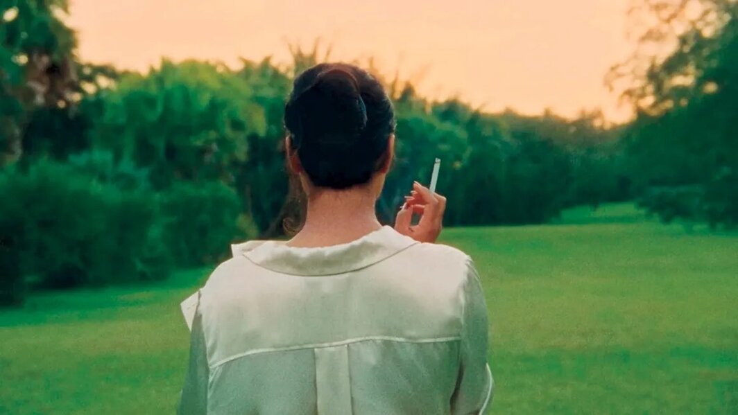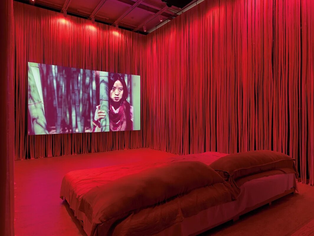 如果说我描述的所有艺术家都在设法解决如何将历史带入当下的问题,那么,黛安·塞弗林·阮(Diane Severin Nguyen)的电影装置作品《在她的时间里(艾里斯的版本)》(In Her Time [Iris’s Version],2023–24),则最好地概括了在这个社交媒体算法和新的网络文化表演性充斥的时代,谈论历史——尤其是创伤性历史——的矛盾和反作用。(甚至连标题都暗示了不同时间跨度和视角的冲突)。这件装置在很多方面都是朱利安的《再一次……(雕像永不消亡)》之对立面:朱利安选择了开放而延展的空间,阮的空间则紧凑而密闭,让人感觉或舒适或幽闭——取决于观众自身对拥挤房间的容忍度。展厅中央的一张厚软垫床占据了所有可走动的空间。朱利安的作品中柔和的黑暗环境,在此被红色的灯光和窗帘所取代,让我顿感既可爱又花哨;朱利安的黑白画面所承载的历史感和肃穆感,也被一个单一屏幕所取代,画面中鲜艳的色彩被红色的氛围所过滤。显然,艺术家在此着意营造了一个梦幻般的场景,既是斯坦·范德比克的《电影梦》(Cine Dreams,1972),也是大卫·林奇 (David Lynch)的《双峰》(Twin Peaks,1990–91)中的“红房间”的延伸。