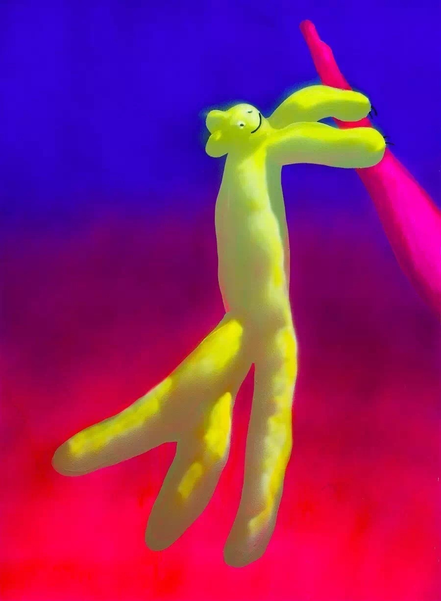 站在阶梯两侧的3D打印、手工上色的《穿鞋子的人》(The Shoe Wearers, 2016)引导观众步入奥斯汀·李(Austin Lee)在BANK新空间的个展“光的绘画”( Light Paintings)。从两列雕塑中我们不难发现艺术家试图赋予数字材料人性化特征的线索。就绘画而言,奥斯汀·李通过喷枪和画笔把iPad草稿转化到画布上,由此,艺术家之手在自由微调构图的同时保留了绘图软件固有的数字感。以《轻质》(Light