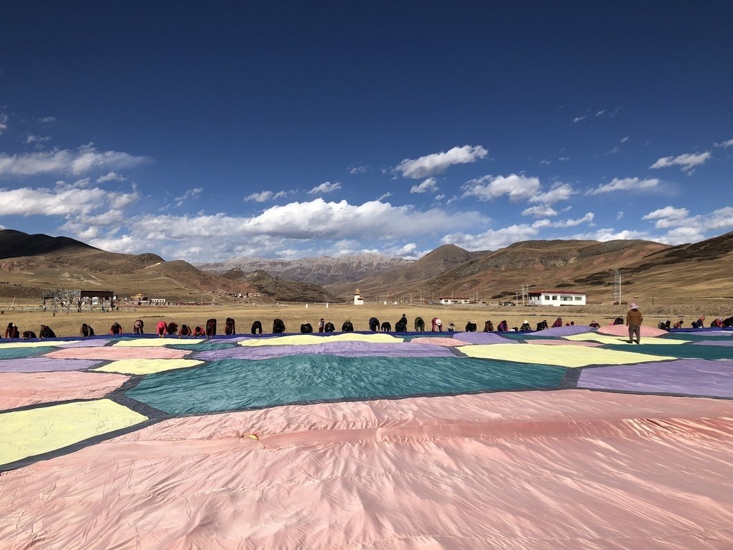 2016年10月,带着《精神高于一切》,赵要再次奔赴玉树。这件宏大的作品在北京完成设计和制作,然后被运到青海省玉树藏族自治州囊谦县白扎乡摩耶寺曾尔尕山。在那里,巨大的画布由当地信众摊开,并在山上晒了五个多月。赵要借用了当地“晒唐卡”的习俗:在此一年一度的仪式中,当地信众在活佛及寺庙僧侣的带领下,将寺中供奉的古老唐卡绘画(摩耶寺所藏唐卡有些比赵要的作品还要大)从室内抬出,晾置于山上一天后再抬回寺内。这一仪式已经根深蒂固地成为当地日常生活的一部分;它虽是一种宗教活动,但因其规律和频度,对当地人来说,已经不是什么日常生活之外的体验。