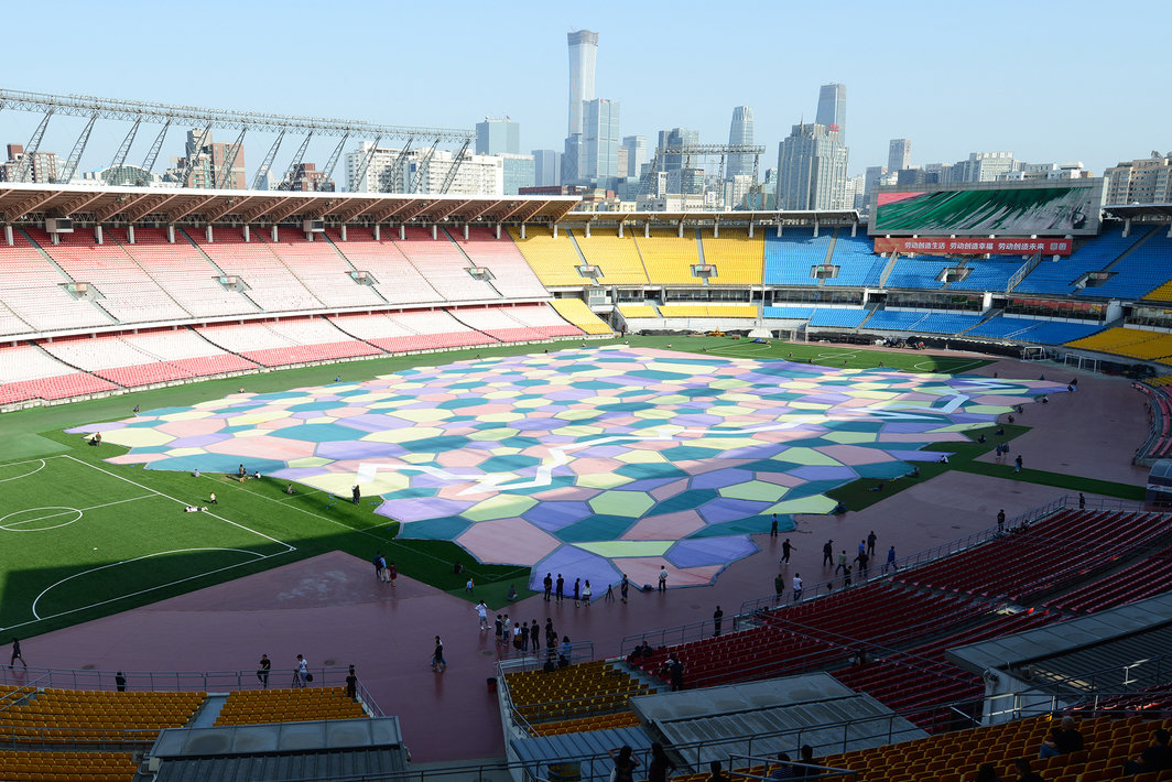 赵要把他一万平米的作品带到了工人体育场,并将其为期一天的展示称为“自然的力量”。请想象一张以布料和织物制成的巨毯,上面是艺术家绘画实践中惯用的抽象图案。(赵要过往作品以借用益智游戏图书中色彩鲜艳而形式复杂的图案著称。)5月18日清晨6点,赵要及其五十多人的团队在足球场上铺开了这一巨型作品。