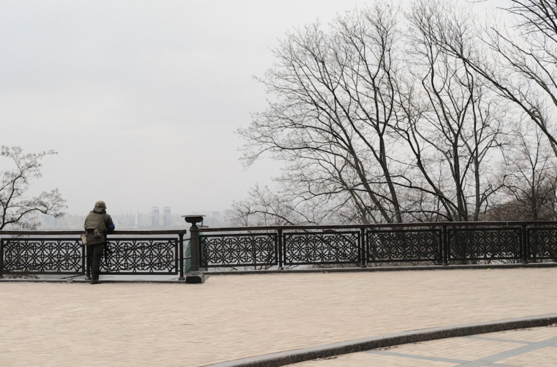 在回来的路上,我突然想到去拍摄基辅最难言喻的平庸景色,复制游客在第一次访问这个城市时会去拍的照片。我来到了雕塑公园,几个父母带着他们的孩子在散步,也有一些人在遛狗。我本来想拍一张风景照,直到我突然发现天空中飘荡着紫灰色的烟雾。