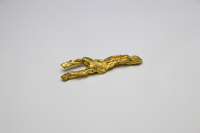 我们的肉身是我们自己的本我、自我、超我的阶梯吗?艺术家王思顺在这场形朴蕴深的展览中分别采用了金属、泥土、纸、大理石、胶片与身体上的脚跟、头颅等展开一场“太极”。艺术家用牙齿咬出来的24K金的作品,那么小,只有一截普通指骨长短,看起来好像异型钥匙、生殖器官,或是一个人形:用牙齿这一身体骨骼去塑造另一重坚硬,用唾液去接触这黄金的冷,之后,身体的一部分永远留在这个作品上——齿痕、DNA是作品对身体的记忆。这件微小的作品安静地躺在展柜里,好像岁有千年,不断地被更多身体观看。在如斯蕞尔的作品前方,却摆放着以艺术家身体为蓝本的洁白雕塑。大理石里,石英的微芒不断星星点点地到达体表。它演绎了王思顺的一个梦境:行走、踢到自己的头颅、捧起来、观看。微曲的双臂在完成一场贡奉:将自己的头颅作为一种特殊的“牺牲”贡献给看不见的造物主。头颅上眼睛正平静地仰看自己,但从这个不可思议、脱离自我的角度来观看。在这里,“石头”与“精神”形成对冲,一颗石头内部也有跳动的心脏——通过梦境的暗示而诞生的石像,表演了一种“出体”的可能性——某些人群通过某种方式,脱离自己的肉身,以一种精神存在的方式于另一维度里检视现实与梦境的距离。在艺术家对“身体”的自觉创作里,同样布满了羞于言说的蛛网:并不光鲜,但也不完全黑暗,因为生命常常被一种惊人的战栗所唤醒,从身体内部传导至体表,这种战栗持之以恒如同大提琴的低吼与波涛相匹配。