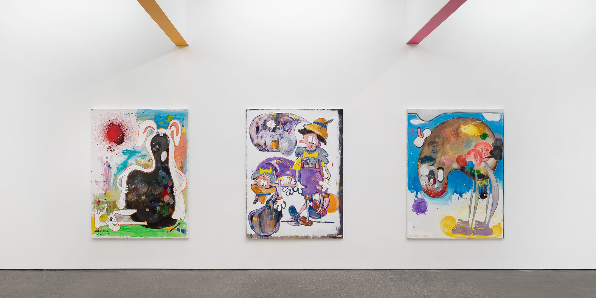 武晨的新作在童年经验中寻找符号,将匹诺曹、蜡笔小新和卡斯伯挪用为当下的寓言。而作品在标题和画面间呈现癔症式的关联,一面是涵义暧昧的绘画叙事,在视觉上呈现出混乱和痉挛;另一面则是直截了当的文字定论,“所以”、“别再”、“都不是”等类似福音书话语的表达,指出了在游戏和漫画中没有模棱两可,更多的是非黑即白。武晨正是在二者的错位中,试图作出他的审判。展厅上方,作品标题的大字横跨墙面和横梁,隐约指涉着798厂房过去的革命口号,政治标语的形式使得荒诞的语句产生了训诫效果。
