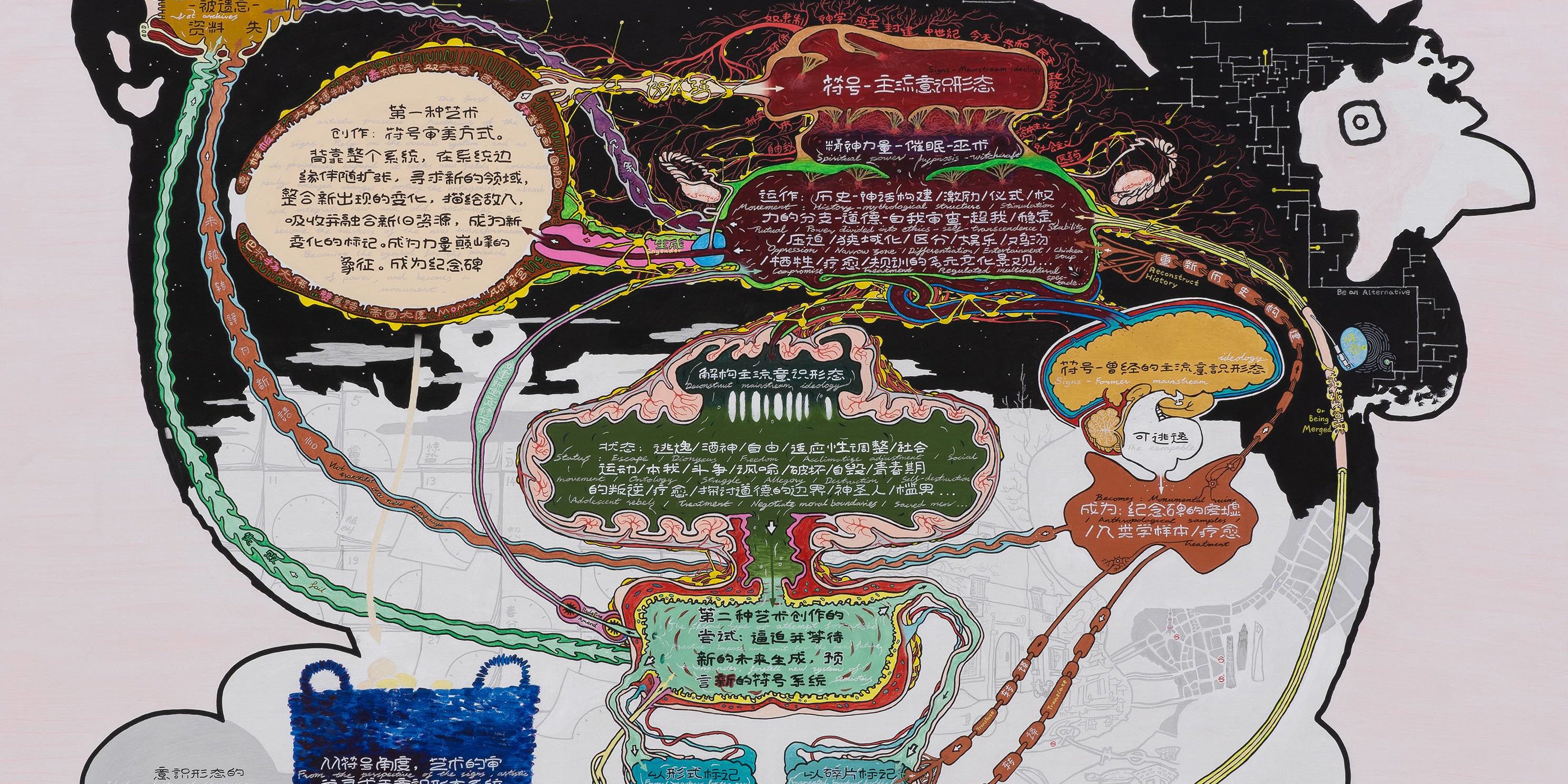 放置着几块岩石状座椅的空间内播放着单频影像作品《数》(2020),镜头从黄褐色的砂石开始匀速推近,营造出荒漠疏离、冷僻的气氛,然后镜头转向了人物手部特写:一位身着银行制服的女柜员在辽阔的沙漠中熟练地数着并不存在的钞票。这个重复不间断的数钱动作与场景的不协调成为画面的最大张力,甚至超过了对柜员的个人身份的猜测,以及创作者赋予她的意义。摄影装置作品《金·言》(2020)也制造出了类似的效果:在广袤的自然环境里,一个躯体被一床写着“AN ARTIST WHO IS NOT BASED IN THE GOOD PLACE IS NO ARTIST”(一个没有工作生活在好地方的艺术家不算是好艺术家)的被单覆盖,他时而躺在黄沙上,时而在浅滩旁搁浅。现场没有有效的信息透露这个床单下覆盖的人是谁,留在我们脑海的唯有那句话:一个没有工作生活在好地方的艺术家不算是好艺术家。艺术家或许意在传递一个讯息:当全球化的消费主义的大潮袭向我们时,个人独特性甚至人性的元素会在其中沉浮乃至被淹没。