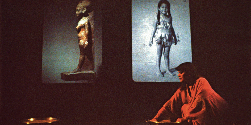 用谷歌搜索“娜芙蒂蒂的姐妹”,洛兰·格拉迪(Lorraine O’Grady)《混血家庭相册》(Miscegenated Family Album, 1980/1994)里的一张双联照片排在第二位。其中,艺术家将自己的照片并置于埃及女王娜芙蒂蒂之妹——穆特诺杰美特(Mutnedjmet)半身石像照片的旁边,两张都是四分之三侧面像,看起来极为形似。紧随其后的搜索结果同样来自格拉迪的该系列作品:仍然是那尊穆特诺杰美特半身像,只不过拍摄角度不同,旁边的照片则是完成于公元前1340年前后的娜芙蒂蒂雕像(这次的两张照片相似度没那么高,尽管两人是姐妹关系)。再往下拉是该系列里另一张双联照:娜芙蒂蒂之女——梅利塔顿(Merytaten)的雕像加上格拉迪侄女——坎迪斯(Candace)的照片。除了拍摄对象本身形象相近以外,两者的形似还应归功于裁切和取景等技巧:差不多一样的姿势,若有若无的微笑,圆脸,黑眼眸,弯折的眉线。和格拉迪该系列中十六张双联照片的大部分画面一样,这些图像是亲密的,亲切的,如同放在家庭相册塑料封套里的照片。