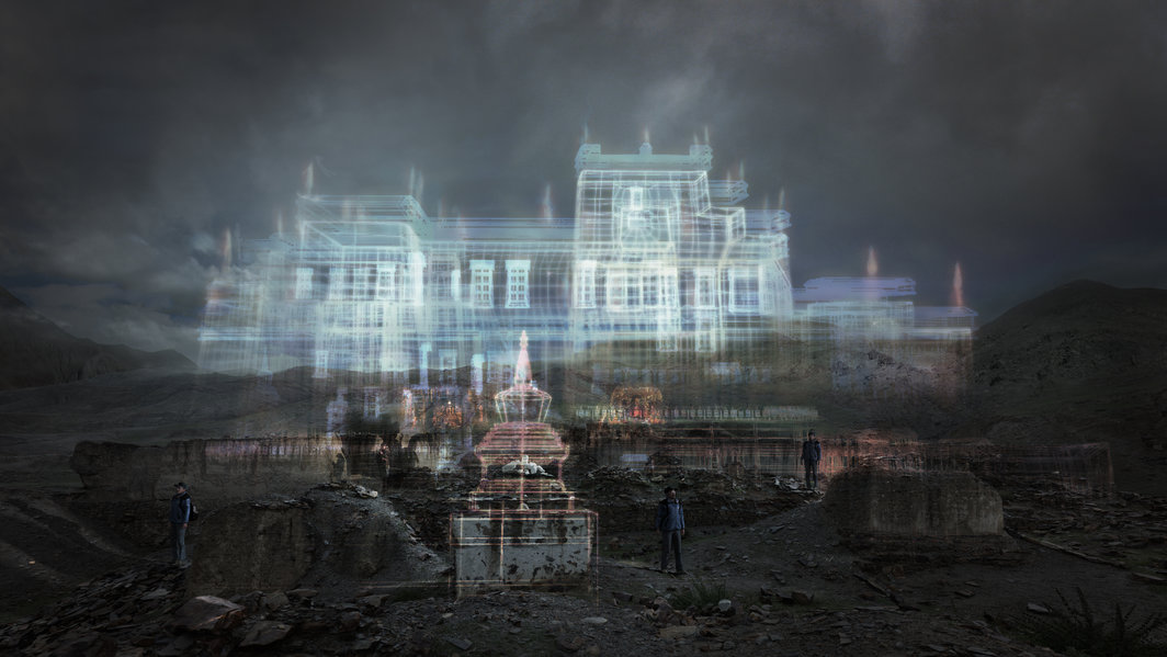 张小涛一直试图在自己的作品中探讨人类终极的宿命。此次展览的作品从最初的构想到最终呈现,艺术家与其创作团队以田野考察的方式深入到萨迦县这个面积7510平方千米,人口不到五万的萨迦派圣地进行纪录片的拍摄和素材收集。与当下新媒体艺术家大多数表现流行前卫,抑或反映个人生存体验的作品不同的是,张小涛将其表现触角延伸到了更为广阔神秘的宗教,影片中无数的矩阵排列,使观众在动画中看到的多是充满时空交错的事物,手印,血管、佛教寺庙里的高僧、现代钢筋水泥中的上班族。我们从影片中不难发现这些碎片化的,看似支离破碎的个人化组合所反映的恰恰是一个所有人类需要共同面对的困境——我们的灵魂在这个快速膨胀的时代将于何处安放?