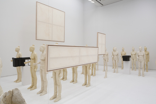 藤原西芒(Simon Fujiwara)的展览“白天”涵盖了他近几年推出的新作和分散在不同藏家手中的旧作,如此大规模的陈列似乎意在消除创作与策展间的界限。其中一间展厅内摆放着一个形似斯大林的古董面具,和一个在日本二战投降后,由其占领菲律宾期间的通用货币所制成的扇子。另一边,藤原西芒又在扮演着雇主的角色。绘有一杯杯牛奶的油画系列“乳糖不耐症”(Lactose Intolerance, 2015),是他从北韩最大的国营艺术工作室“万寿台”订制的。具有讽刺意味的是:北韩是世界上唯一一个不生产新鲜牛奶的国家。