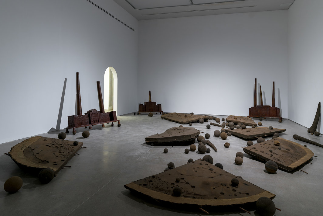 《在寒冬,巨人们聚集在广场中心,用沙做的圆球按照星辰的方位,玩一种弹球游戏》(除标注外,所有作品均创作于2019年)长长的作品标题本身就已搭建起一种诡异的叙事,作为雕塑材料的沙土则以粗粝的质感呼应着标题暗示的冰冷与时空规模的转化。整个场景的怪诞令人联想到欧洲文艺复兴时期一部以同样风格著称的小说——拉伯雷的《巨人传》。如果说《巨人传》中的狂欢式语言指向尚未被彻底个体化的民众身体,陆垒作品里充满哥特感的工业特征则只是他自己成长环境的变体:化工部大院生活的记忆使工厂与集体经验化为不可磨灭的印记。展厅一角,《在夏夜,巨人们用捕蝠器,召唤蝙蝠》所复现的俨然是锈迹斑斑的苏联式工厂建筑与烟囱。