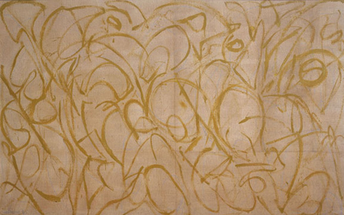 比如1961年一幅大型的横幅油画《月亮潮汐》(Moontide),色彩为栗色,黑色,黄绿色和白色。虽说她在构图上仍受到后立体主义绘画空间的影响,但在颜料的运用上却产生自主创作的能量,令人想到回旋、漩涡和平面本身。《库法字母》(Kufic,1965),粗粗的芥末黄线条,零落地分散在未上色的画布上,题目想必和那些漩涡般的书写图形有关吧。这幅画的透彻简约与早期的作品如1963年创作的《百鸟图》(Bird Image)和《花满枝头》(Flowering Limb)形成鲜明对比,在后两件作品里,浓郁的色彩交织在饱《库法字母》迥然不同。展览中的其它作品泽是漫不经心而为之。《先知》(Messenger,1959)的线条画得随心所欲,看起来,时而像人像或眼睛,时而又似乎什么都不是,毫无意义可言。相比之下,1960年创作的《守夜》(Vigil)和《播种》(Seeded ),看起来太满了,在表达呈现上多少有些莽撞,用力过度。克莱斯纳顶峰时期的抽象画中更为生猛的活力和挥洒的自信,更加重了之前提到的这种厚重感。