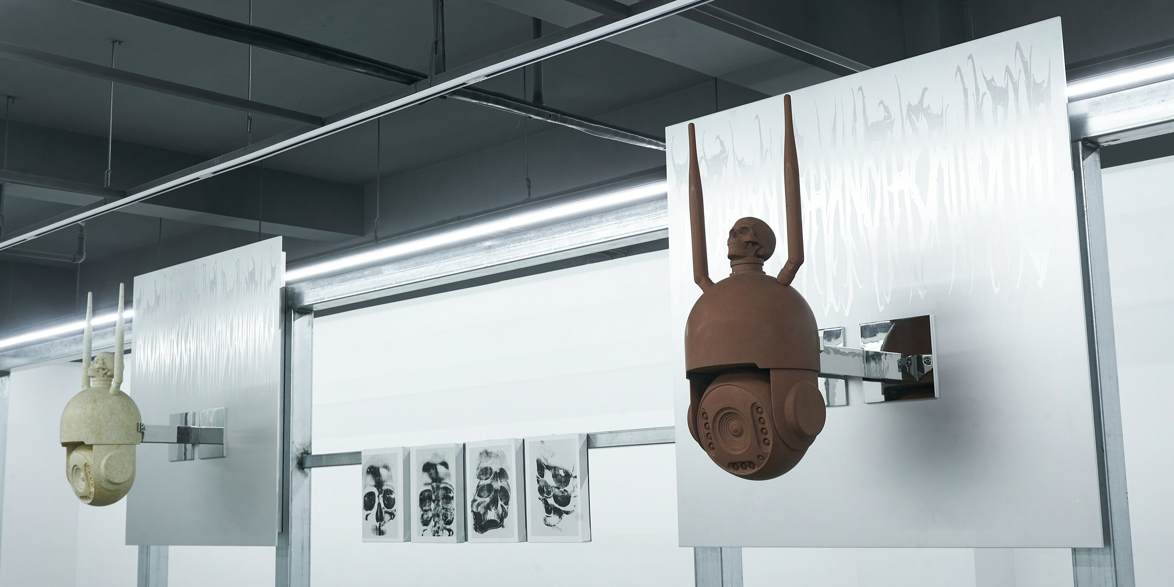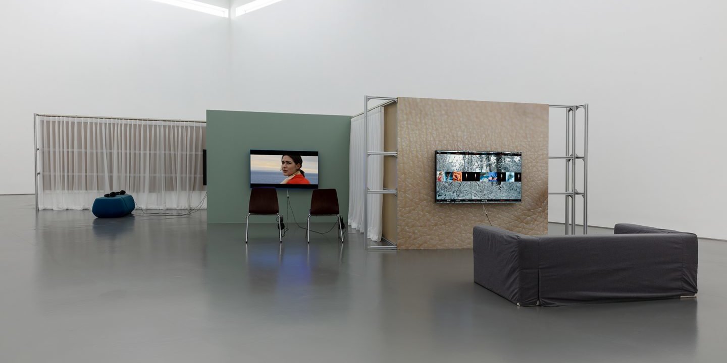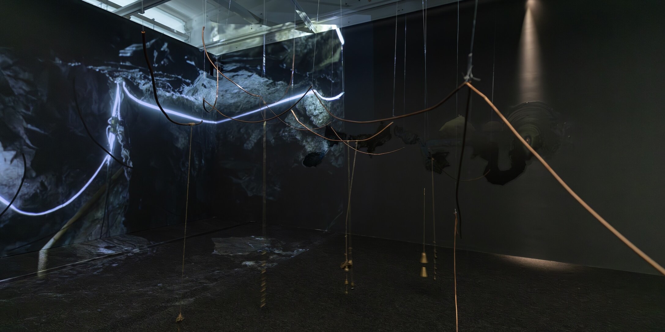 一楼的其他四件作品排列得近乎对称,仿佛四种截然不同的风景观。盖琦正的驻地创作从本地的水库基建出发,既有田野调查的结果,也有延展至全球水库大坝的邮票调研,信息密集,有些缭乱满溢;与他相对的张东辉的《走河》(