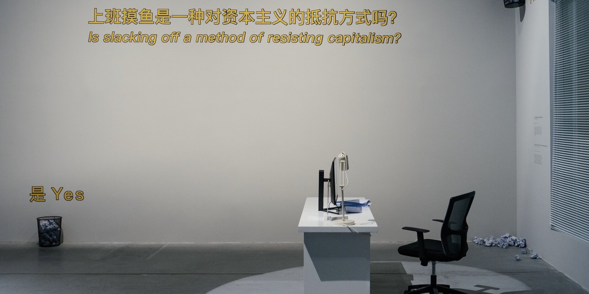 在摩登的消夏氛围里走进“投石问路”的开幕式,有种奇异的冷却之感。艺术家石青正在念诵着关于此地经济制度变迁的严肃文稿。这件在开幕发生的现场作品,立刻提示了在度假休闲之外,这里丰富而隐蔽的地方历史。前排有人听得专注,但更多的是坐在地上和四处游走的涣散观众,一楼空间成为了一场夏日讲堂的展演。