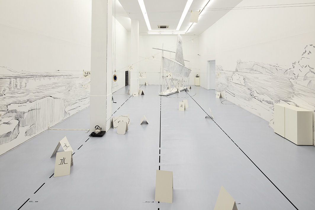 展厅的阶梯入口处,艺术家用蓝天白云壁纸制造了一片人造天空。半透明的巨幅织物“山水图”紧随其后出现在观众眼前,该图像最初源自乡间戏曲的舞台背景幕。在展览现场,由于织物轻柔、极易晕染的质地,苍山、亭台,以及缭绕的白雾在颤动的空气中如幻觉般地聚集在展厅中央。围绕在这幅山水布景周围的则是旦儿从大量原始素材中摘取的图示样本:充满吉祥寓意的动物(如猴子、孔雀、老虎、仙鹤等)、传承至今的几何纹路,以及故事场景里的人物肖像。通过元素提取、细节放大以及原型重现的方法,艺术家将我们带回了被逐渐遗忘的乡野生活现场。