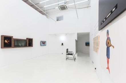 麻剑锋个展“不可调和”在布展中进行了十分主动的空间分割和观看引导:一条狭长的通道把空间分为左右两部分,在左边靠近橱窗的区域,麻剑锋延续了他惯用的空间-绘画的场景式布局,利用廉价包装材料和建筑废料搭建了一处热带风情的岛屿;另一侧则以布面作品为主,提示绘画语言的“拆解”和“重组”在平面内部的演变过程。在通道尽头,头顶上方围绕的环形结构相当于一块能量聚集/冲突的区域,是来自平面和空间两股力量的交汇处。