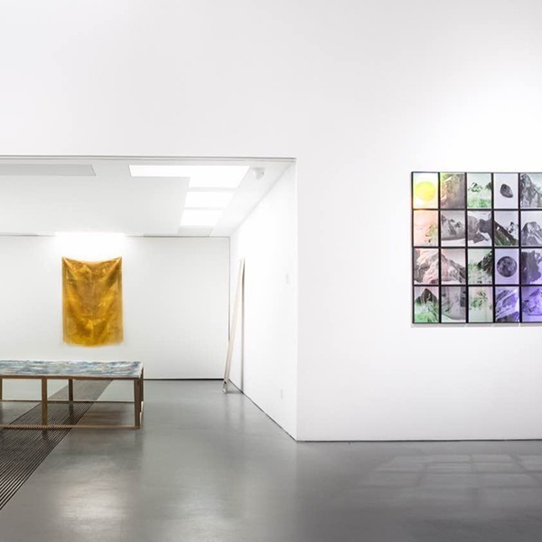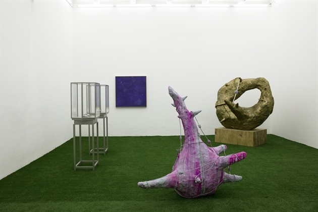 在展览现场,录像作品《无光无影》(2013)中体现“大地零点”的概念,象征一种处于原始或未来之中、意识形态尚未形成或被消解之后的混沌不清的状态,其中穿插了一些商业性极强的珠宝展示特写画面;在展柜的两件作品中,精致珍贵的珠宝首饰放置在粗糙天然形态的石头之上,一旁的铸铜雕塑《化石203号》(2015)与《化石411号》(2015)则用模棱两可的形状象征来自化石和海洋的能量,光滑的珍珠被刻意的安排从其中穿插而过,而挂在墙上的紫色绘画《Lasaia Arsis》(2015)是艺术家跳绳锻炼身体时在画布上留下的痕迹。