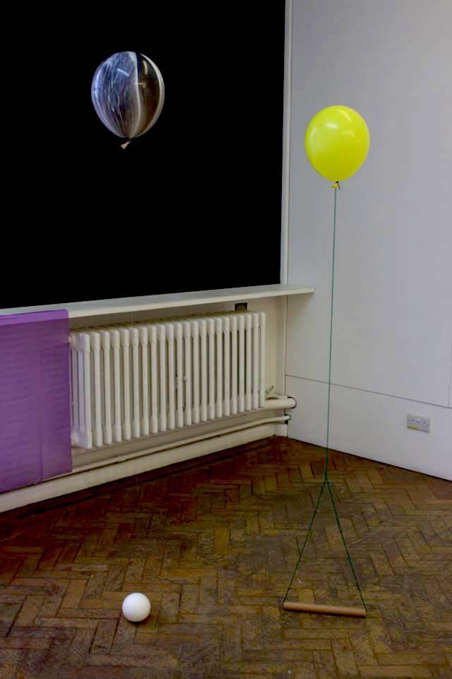 在展览准备的20多天里,橡胶、硅胶、亚克力、玻璃、铁、铝、混凝土,这些偏向中性的工业材料在钟云舒的手上悄悄进行着转化,它们所构成的球体、线条、块面,多半是抽象且无所指的表达。而观众容易忽视的,是作品中穿插的隐秘细节:硅胶水弹和玻璃珠真假难辨,藏匿在缝隙中的玩具鱼,细小透明的隐形眼镜,躲在消音板背后的橡皮球,以及材料表面保留着的商标等痕迹,作为现实属性微弱的暗示。在这个奇妙世界中,抽象事物都庞大而具体,具象事物都渺小而脆弱,这些由质料而来的形式与物质本体之间相互作用,构成前后、左右、明暗、松紧、大小、上下、高低的形式关系,形成不断转换的力量来源。由于质量的守恒,物体在空间中存在的同时也在逐步的消解,它们都在稳定和不稳定的博弈中存在着。在展厅一角,《piao》(2016)由多件用管状物悬挂在半空中的物件组成,从这些组合可以明确这种作用力是如何生效的:橡胶皮在能量交替中产生微妙的弯曲,波浪形的密度板则显现脱离外力的自身变异,抛去形而上的怪圈,物质的属性在与其他物质的作用关系之中显现。展览中的三件作品名称体现出艺术家希望消解艺术主体的愿望,而分别以复印机、上海潮气、电子屏幕取而代之,对应绘画、雕塑、影像作为二次表达展示。《电子屏幕是艺术家,我不是》(2014)对一组餐桌画面进行多次翻拍,寻找影像重叠之中产生的均值化效果。《上海潮气是艺术家,我不是》(2016)和《复印机是艺术家,我不是》(2013)分别利用因潮气而产生弯曲的密度板和由复印机偶然产生的复制效果,从转述中体察自然与主体之间隐藏的缝隙。从偶然性的经验出发,代替必然性的理念,更像是用一种反经验的方式去阐释经验本身。