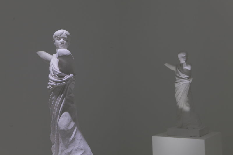 在准备这次个展作品的过程中,最早确定下来的是《平等纪念碑》,然后是《包豪斯的魔方》,最初设想至少要展出这两件作品,《两个雕塑》则是后加进来的。 2013年在准备参展中央美院举行雕塑系的群展时,我设计了这样一个形象:把自己的头部替换在女神像上,而这个身体的造型源于上世纪八九年央美雕塑系集体制作的那件“女神像”,后来,由于这件作品关涉到政治风波而无法展出。在这次个展中,我用石膏重新翻制了两件,打一盏顶光一盏底光,让它处于具有辩证关系氛围之中。