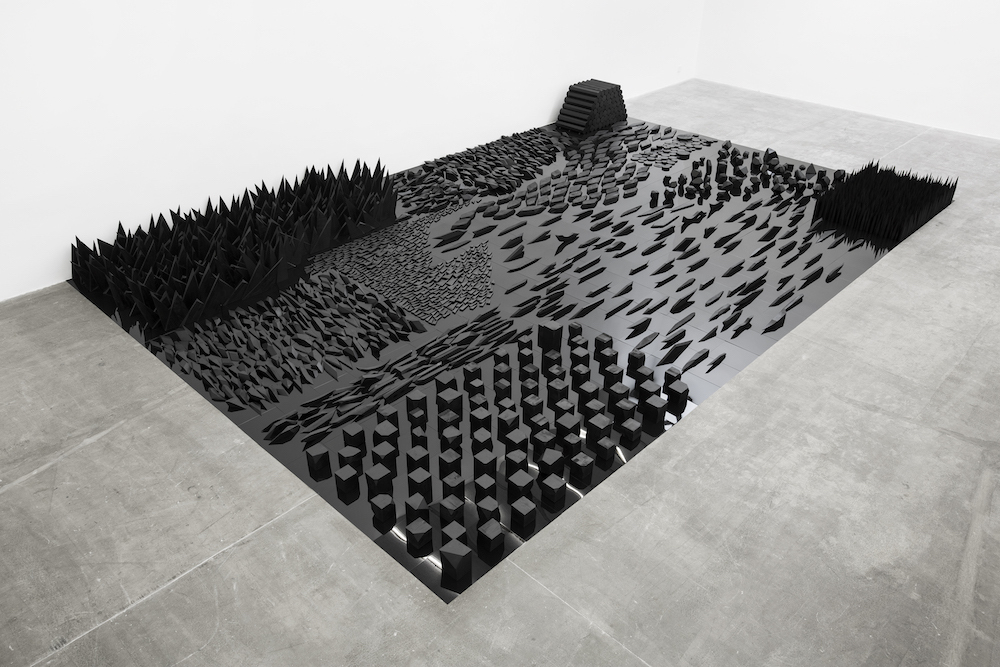 从2013年开始,杨牧石坚持在工厂中进行作品的制作和监督,创作过程具有持续性和重复性。选取有限的几种工业原料,刻意遮蔽它们的物质属性。从展厅布置中,清晰地体现出他对作品各部分与整体的同步掌控:每组作品通过类型化和复数性质进行归置,利用来源相似的材料、完全统一的色彩、在现场根据空间情景组织安置作品,形成简洁的轮廓与形状——这些特点在《消磨》(2013-2016)中得到了集中体现。它由若干堆几何形体组成,每一块木料似乎都被赋予独立存在的权利,又根据质料和形态的不同而类聚。类似的形式语言在西方1960年代大地艺术和极少主义作品中似曾相识,彼时理查德·朗(Richard Long)曾经断言:“艺术就是选择,集中,仪式;一个简洁的视觉效果。”而杨牧石将艺术品放在了“生产”的当下语境中。正是在仪式化的放置里,在展陈的空间中,在艺术品交易的体制下,生产过程中的“无效”渐渐转化为“有效”;另一方面,在这个飞速膨胀的物质世界里,“效用”本身是值得质疑的,“无效”或“有效”可以作为价值评判的标准吗?