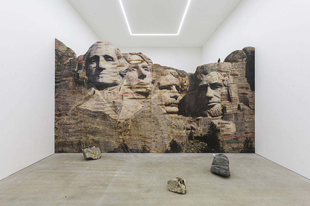 风景在浏览之中,就像滑动手机中稍纵即逝的图像,在输出信息的同时,不停制造新的印象。从何时而起,风景的定义与观看方式一同发生了变化,对自然从画面之外的凝视在徒步者的漫游中变成了身在其中的观赏,如同诗人随步伐而改变的韵脚。在华兹华斯诗歌创作的背景中,风景与风景画、诗歌之间的相互浸透和诠释,使18世纪英国文化精英的风景趣味得以传播,从而让观景成为具有文化价值的美学体验;而在拉什莫尔山(Mount Rushmore)之中,融入山脉的雕像让政治与地理形态共生,胶合起民族、国家与风景间的强烈认同感,风景逐渐成为意识形态的载体。梁半在《黄昏漫步》(2016)中将画廊空间一分为二,试图思考在这一演变过程中风景与意识形态间的相互塑形,抑或国家机器建构起的庞大象征体系如何于风景中进行权力的展演。散落在地上的《上帝之手》(2015-2016)系列的六个视频从石缝中发出微弱的光——存活于电子产品中的个体,伴着微观中显现的日常,日夜流淌的情感被还原到手机屏幕中。二楼墙面上的“洞”包含了视频内的另一个《洞》(2016):可乐罐被掷入黑暗中,调动起个体经验于对面那座权力之峰的空荡回响,隐秘于洞中的图像可视为基于艺术家自身经验、暂时搁置悬空理论概念的珍贵表达,即便仅以某种“凿壁偷光”式的微弱姿态在场。