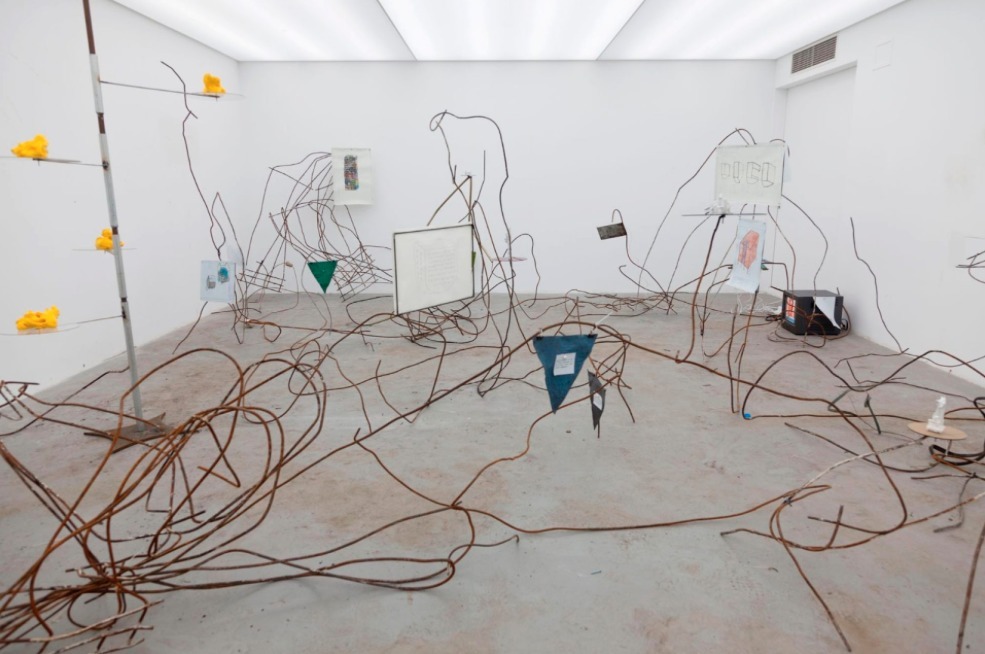 路径是开放的,但并不友好,穿行其中,需时时注意脚下,并与钢筋尖端保持距离,人的身体试图一步步探入钢筋塑造的结构,同时留意到散布其中的另一些物件:一些诡异的建筑物草图和模型,架子上搁置着几块亮眼的明黄色黏土。文字的出现吸引了注意力,弯腰查看,在一张张小纸片上,印着的简短故事,总在讲述牺牲肉体,将灵魂注入建筑的隐喻。屏幕上断断续续地显示着一些思考提纲式的文字,和一个四面都装有吊顶的非现实内部空间。这些废弃物被挑选,被拾得,被放置在陌生的空间,被随机赋形,废墟原有的记忆,仍旧隐藏在其扭曲的形态里,正如艺术家所说,任何废墟的存在总是提示着它的起点——某个初始完整的建筑。从意识形态的冲突直至精神破裂,犹如“第三国际纪念塔”喻言般的存在,只是那个“完整的建筑”永远只停留在意识层面中了,他按照自己总结归纳的关于“废墟建筑物”的法则,对建筑物的实用功能置换和抵消,在草图上涂绘不可能实现的建筑形态,建立起一个在客观感知之上的非客观世界,原本建筑上残留着那种乐观的现代性被替换成了一幕幕荒诞剧。