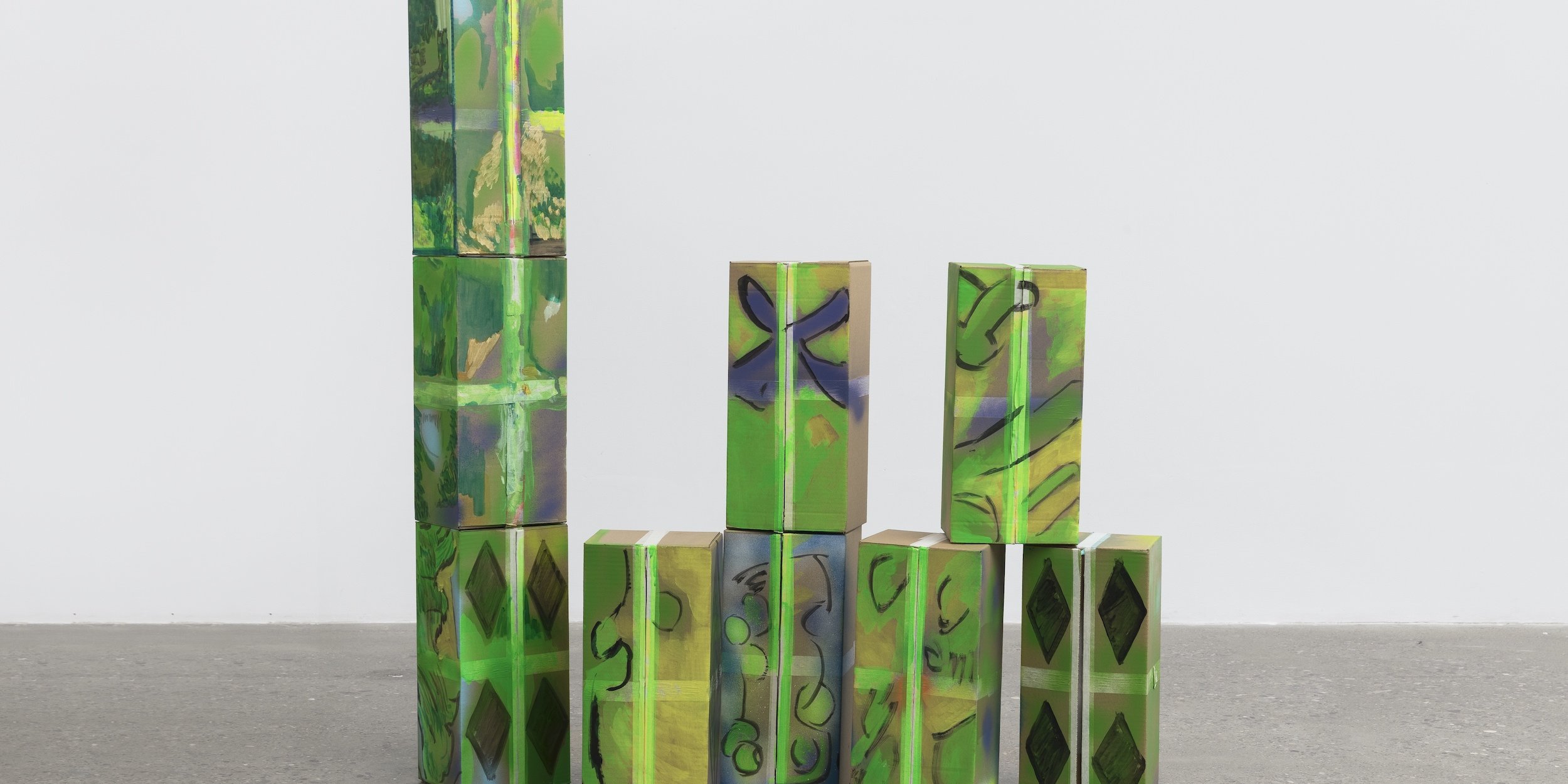 麻剑锋的绘画充满了来源繁杂的图像元素,脱胎于野兽派、表现主义的狂放笔触和浓烈色彩,现代生活的影像片段,原始社会洞穴壁画中的动物形象……它们附着于当代社会消费和发展的剩余物、废弃物之上,形成公共资源和个人经验的混合产物。以往的驻留和在地创作经验,也使他的绘画风格具有错综交融的异域特征。在近段时间一系列画布上的新作中,麻剑锋的工作重心渐渐回归到平面之中,重新剖解点、线、面和色彩关系在画面内部的构成,似乎回到了塞尚与立体主义对形象结构探索的起点。《黑白电影》(2021)中,半透明的灰白色长条状笔触短促而平静地漂浮在紫红色背景上,与《环岛(归来)》(2021)的金黄色调形成强烈对比,条状笔触像鱼鳞一样从金色夕阳中片片浮现,波澜尽头闪烁出更加细碎的耀眼光斑,笔触分解了图像,笔触组成了图像,笔触在蚂蚁洞穴的聚集地诞生了描绘对象之外的多维空间。《菱形-山水》(2019-2020)纸箱上绿色的抽象图案像是从《午后》(2020)的乡间林地中脱落下来的色块,画面上的每一部分都渗透进了形态各异的空间组合,依附于可拆解的立方体,圆柱状结构,或者被切分成菱形、三角形、多边形等各种不稳定的几何形体,就像在《菱形》(2018-2020)一组非常规形状的立面多边形中所展示的那样,空间中的形体再转化为图案,这些图案像是一些对具体事物有所描述的象形符号图腾,形成某种介于风景写生与抽象装饰纹样的中间产物。图案与形状在平面与空间中不停循环往复地变化,与此同时也对应着材料在现场布置中的动态变化,叠放的纸箱开开合合,落地、上墙,在物体形态的重组中寻找一种正在进行中的不稳定关系。