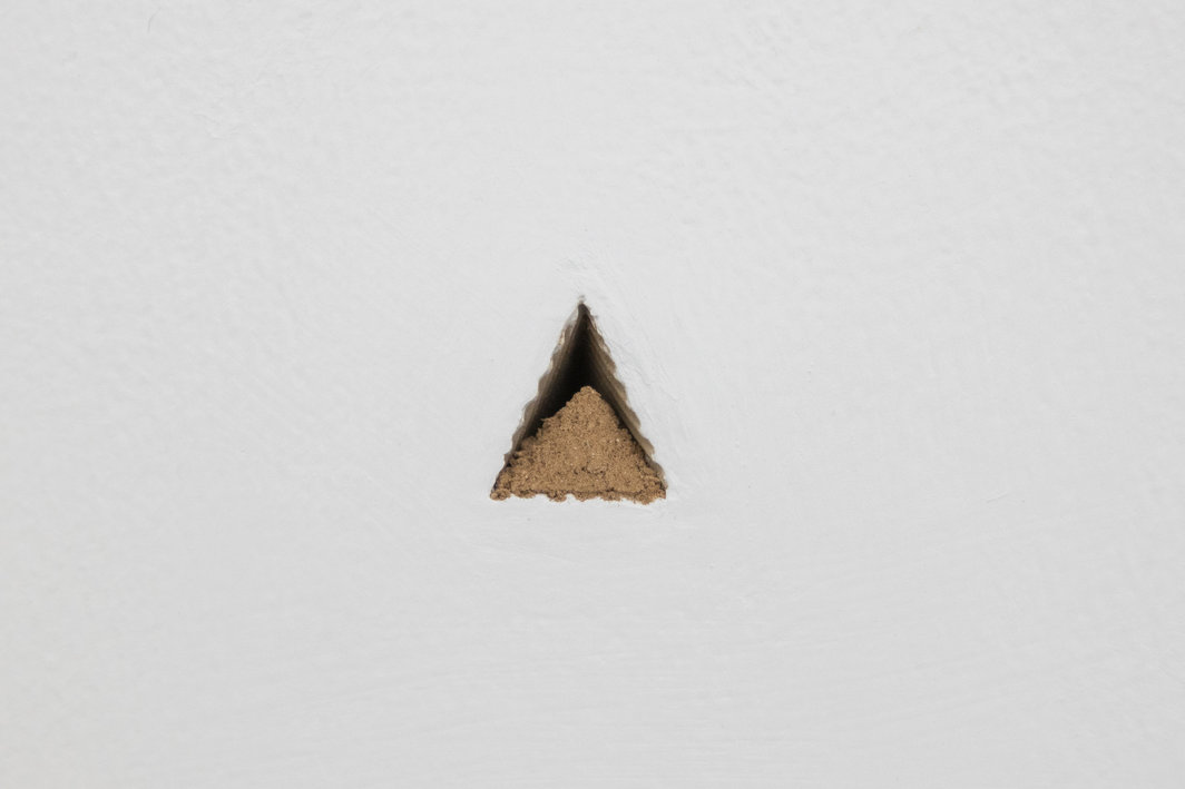 陈丽同将她的小型雕塑描述为生命中破碎的东西、日常生活中的人造物。她将它们重塑成具有生命力的图腾,每件都拥有属于自己的宇宙。一迈入展览“核心样本”入口,就能看见六件由废弃或常遭忽视的材料制成的作品。一个碎陶瓷茶壶盖、泡沫塑料和少许粉色颜料组成了《捕捉者》(2015-2017)。在《紧握 II》(2018)中,一块洗碗海绵、一枚坏了的发夹和混凝土都安置在一个吸尘器零件上,近乎不可能地保持着平衡,看起来摇摇欲坠。粉红色泡沫塑料包装、贝壳和树脂构成的《脐》(2018)放置在一个基座上。这一民族志式的展示方法暗示了一种既神秘又久远的意义。《脊》(2019)是一排紧贴在墙上的轮子,和展览中的很多作品一样,似乎来自一个诡异之物的解剖博物馆。 没有必要辨认出这些物体曾经是什么——它们只以当下的形式存在于现在。