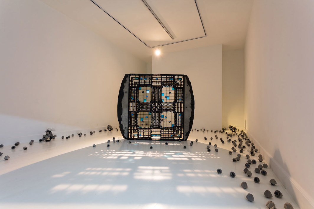 《凝伫之盘(海洋)》(2019)单独占据了一间展厅。一块拾得的黑色塑料运输托盘被直立放置,泡沫塑料和混凝土框架包裹着蓝色树脂方块,给人以花窗的印象,并产生了一种光影棱镜的迷人效果。这儿是小型图腾的敬拜场所——实际上,几十个由黑色塑料、混凝土和巨大的金属螺母制成的小“藤壶”散布在地面。这些虔诚的教徒似乎能够辨识出一些我们无法触及但却能够感知到其深刻意义的东西。