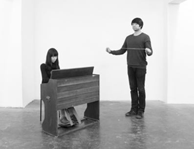 “天鹅”是“小明和小红”继“赞美诗”后在上午艺术空间实施的第二个项目,由展厅里常设的视觉和声音展示部分加上三次现场表演组成。展厅里可看的其实只是一些“痕迹”:白墙上的彩色线段——艺术家将棉线固定在墙上,从两端的线头分别滴入不同颜色的液体,棉线在吸收液体的同时也在墙上留下了色彩;这些染了色的棉线也作为“证物”陈列在场。现场表演的内容是“小红”依次弹奏钢琴的琴键,叠加十个音节,与此同时,“小明”一边“吸足一口气——屏住呼吸至极限——吐气”,一边两手拉扯一根橡皮筋,将它维持在弹性的临界点不被拉断。在空旷的展览现场里回响的声音,是艺术家录制的风琴声——按音键的顺序依次弹奏每个键数秒,最终将六十一个音叠加在一起。更有意思的是艺术家规定自己在整个项目持续期间每天只定量饮用一些流质或水,将生命存活也维持在“临界点”上,对此,其痕迹就难以捉摸了。