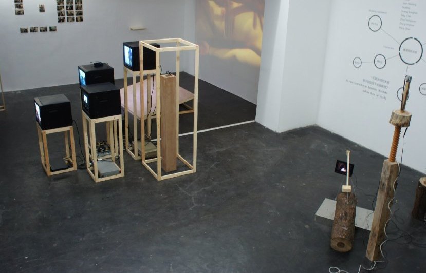 一进门的棋盘就是新作品《不立一法》,以前阳江组是一个空间一个作品,但这个作品我们通过五个项目来破这个空间。我们把“不立一法,不破一法,有法皆立,无法不破”这四句话写在墙上,先有这个书法,然后马上开始我们第二个项目——破甘蔗,把蔗劈成两半,用劈开的甘蔗做棋盘,于是书法就被这个棋盘给破掉了。到了开幕那天有人在美术馆里下一盘象棋,这盘棋最后的结果就会像镜像一样被安置在那面墙上,又破掉了棋盘。其实这个作品我们要破的是阳江组创作上的镜像,也是破我们在当代艺术的处境里产生的一种镜像,希望我们不要迷失,看准一点,准确、到位地表达作品。在展览开幕前我们就已经开始做破蔗活动了。劈甘蔗这个风俗很多地方都有,应该是以前的一种执事游戏吧,估计是卖甘蔗的人想出来的。甘蔗挺难卖的嘛,他就发明一种赌博,赌钱看谁砍得最完整、最多,很多人围着看谁是高手,甘蔗就变成赌博的媒介了。我们用它是因为“不立一法”跟中国很多传统,比如禅宗之类模棱两可的绝学有关,哪里都不立才是真正的立,或者连这个都不要想了。破蔗就是练一种定力,你的心要定,因为你不定那个甘蔗就两边摇,破就是要找那一瞬间,人和甘蔗之间产生的那种定力,它是看不见的,只有来这样玩了,才会有体会。